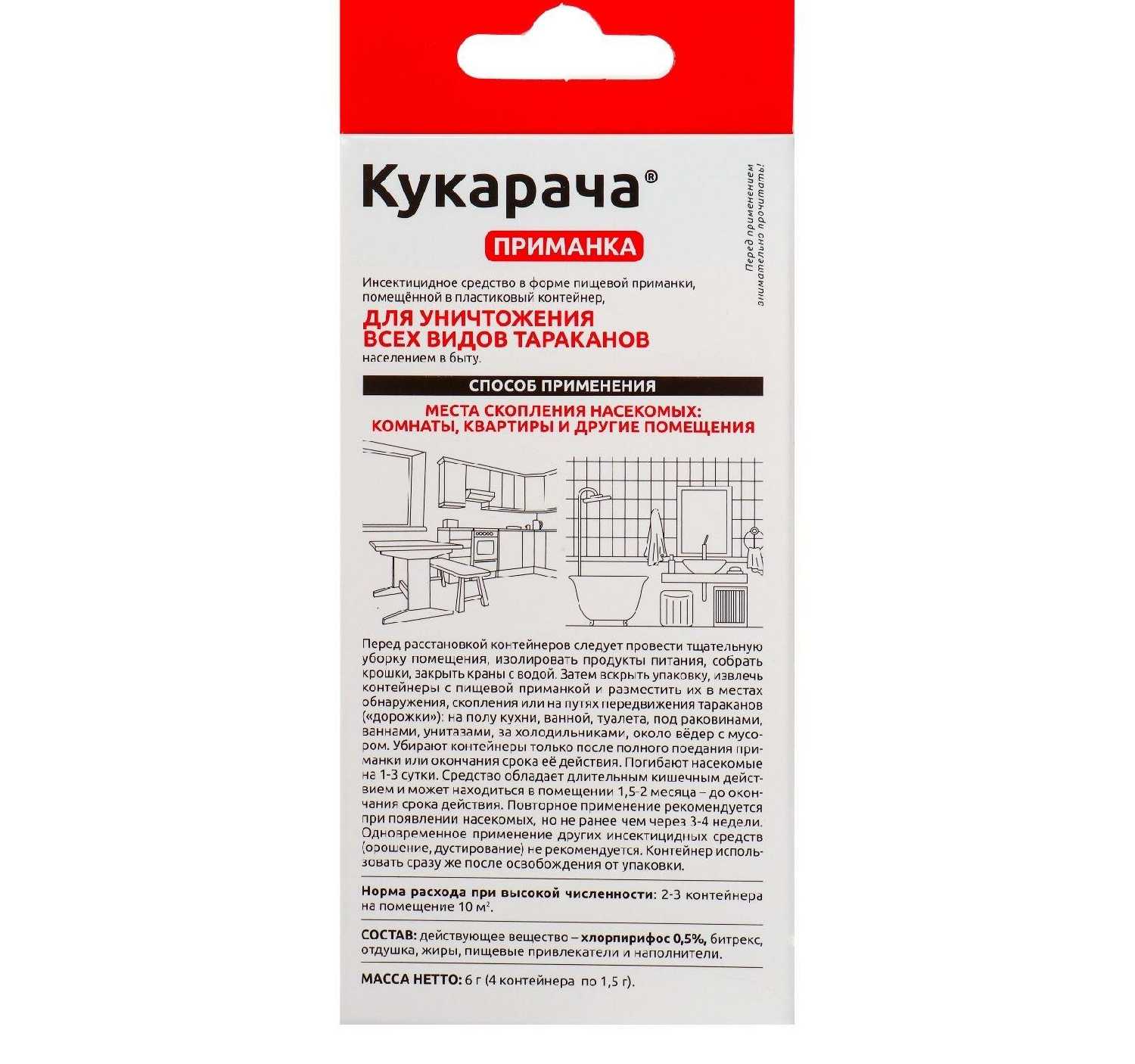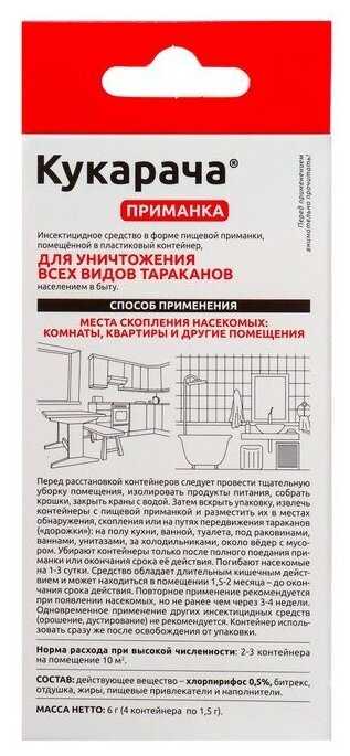 Дополнительная информация : | содержит 05% хлорпирифоса, действует по принципу «эпидемии» после соприкосновения тараканы переносят препарат на других особей вызывая гибель всей колонии в течение 2–3 суток, оснащено пищевыми привлекателями, удобная форма в виде пластиковых контейнеров с приманкой внутри, размещать в местах передвижения и скопления тараканов на кухне в ванной туалете, избегать контакта с кожей и слизистыми оболочками хранить отдельно от продуктов лекарств и кормов для животных, после применения вымыть руки водой с мылом, запрещается попадание средства в сточные и поверхностные воды |
