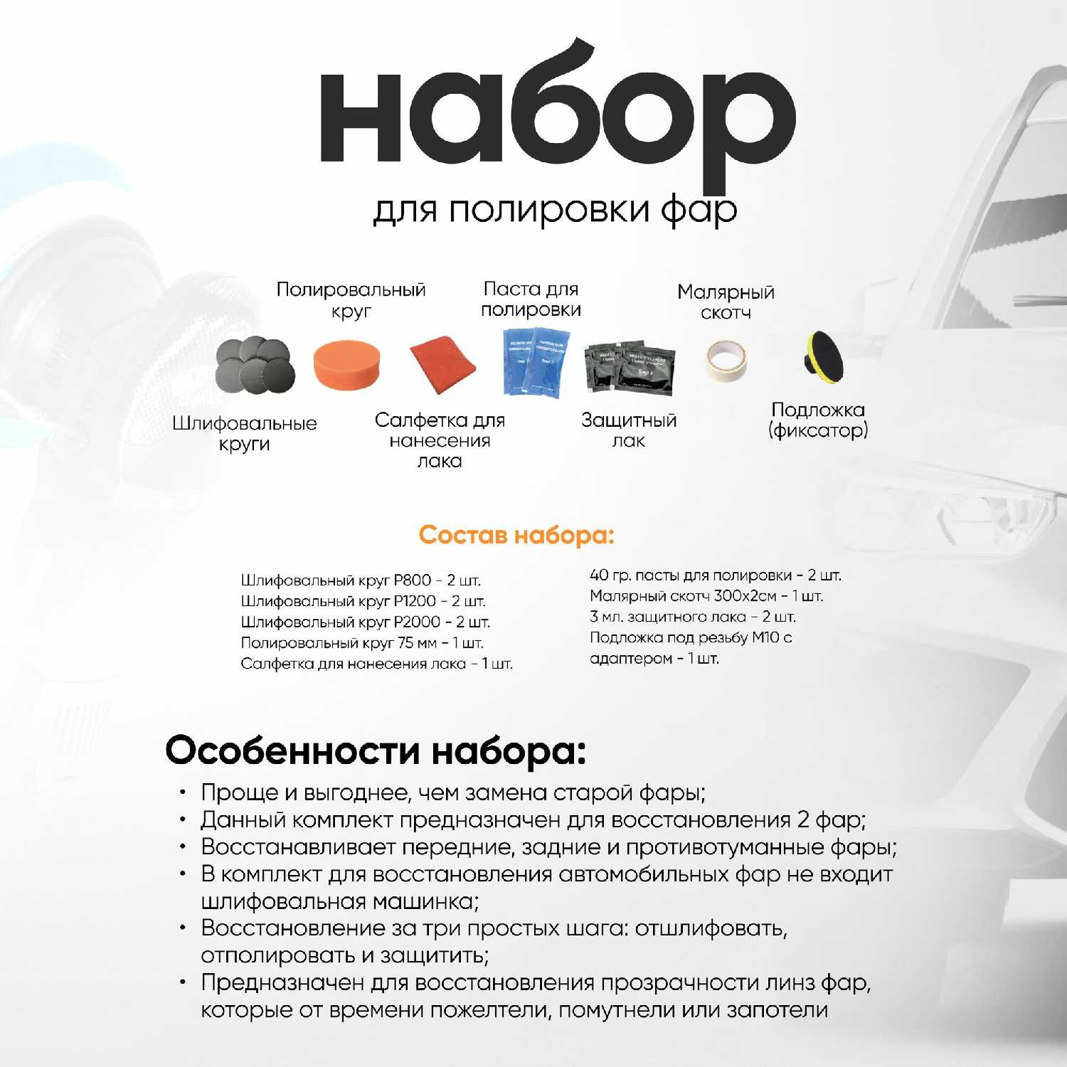 Ключевые преимущества: комплексность (все необходимые материалы в одном наборе), восстановление светопропускания фар и доступность для непрофессионалов. Пользователи ценят возможность избежать замены фар при умеренных повреждениях. Результат описывается как визуально значимый при соблюдении технологии работы.