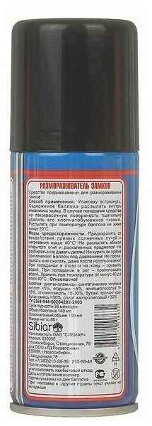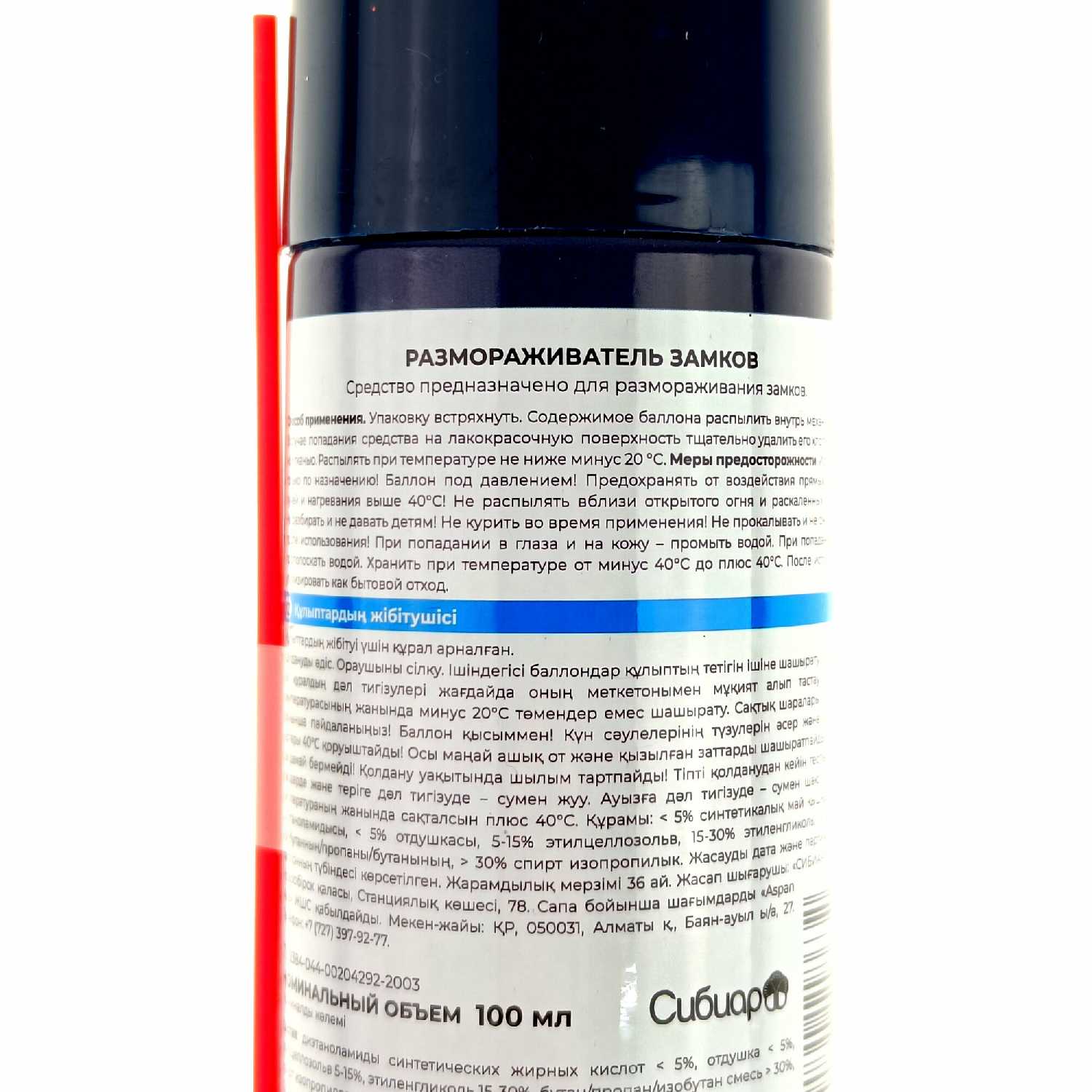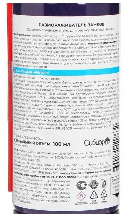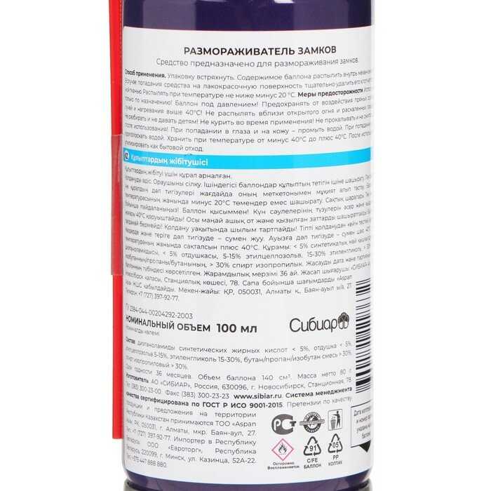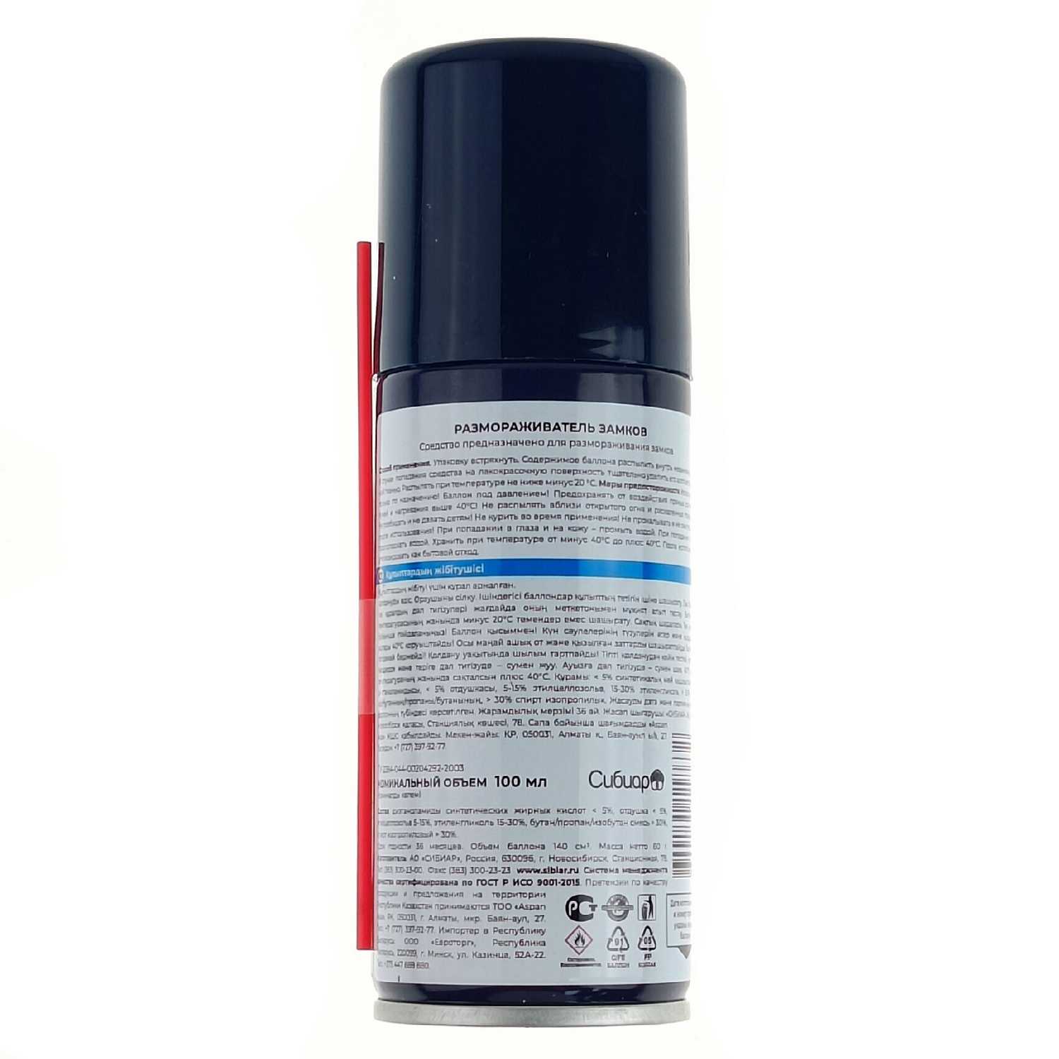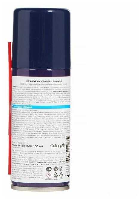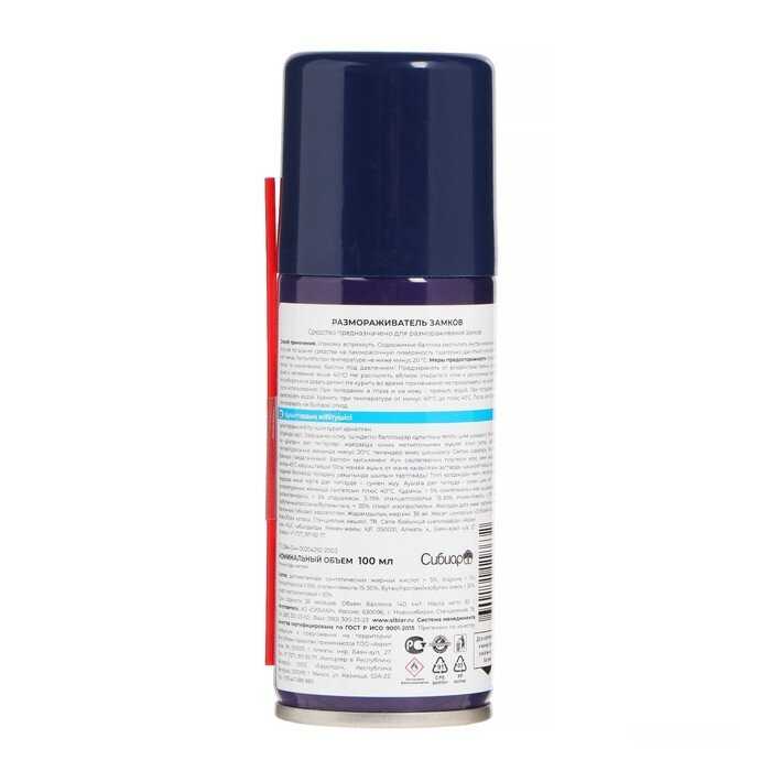 Способ применения : | Упаковку встряхнуть. Содержимое баллона распылить внутрь механизма замка. В случае попадания средства на лакокрасочную поверхность тщательно удалить его хлопчатобумажной тканью. Распылять при температуре баллона не ниже минус 20С. |
