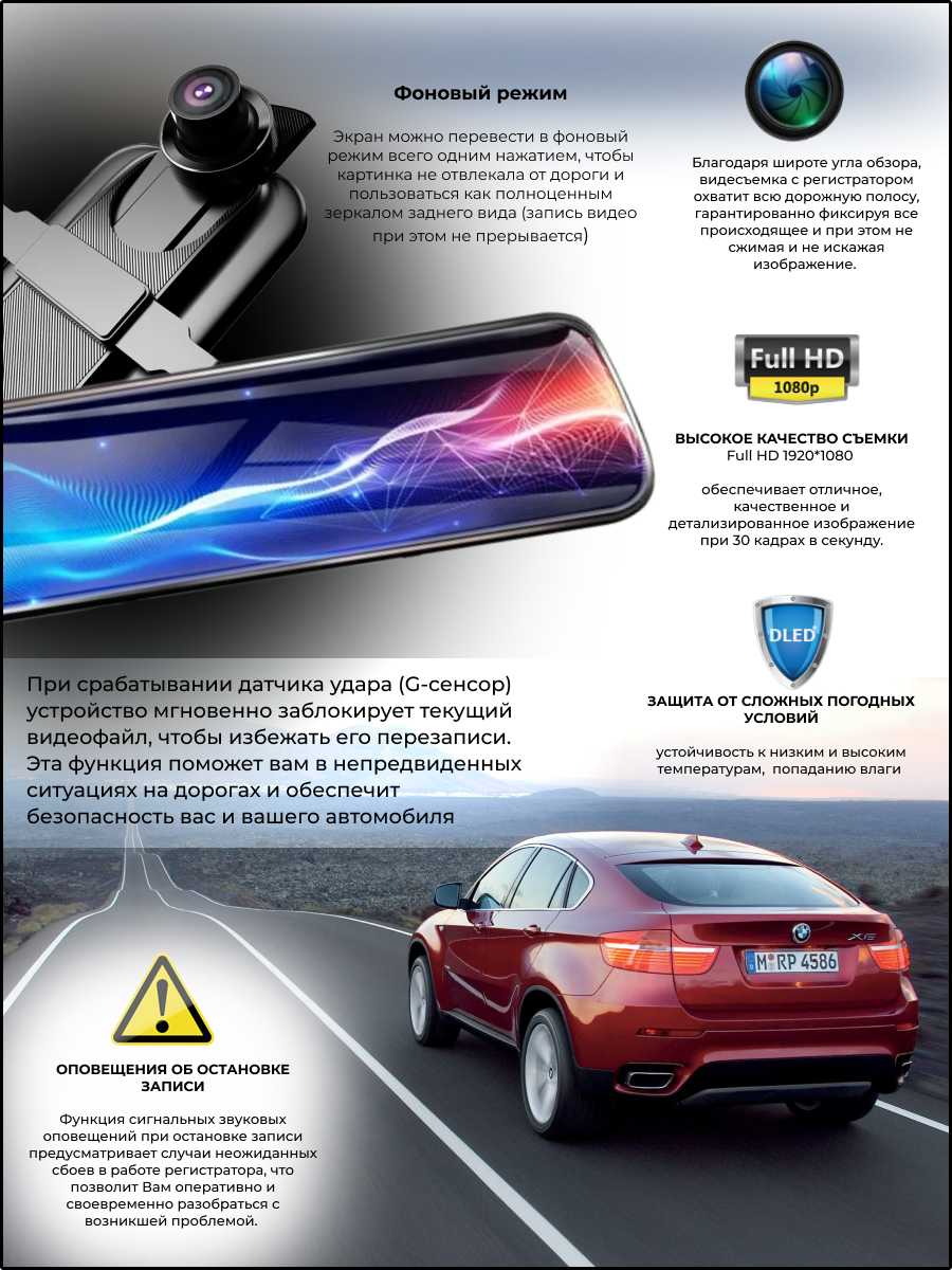 Характеристики:- видеорегистратор с 2 камерами запись видео 1920×1080 при 30 к/с угол обзора 150° с экраном 4" 800×480 датчик удара (G-сенсор) работа от аккумулятора поддержка карт памяти microSD (microSDHC) встроенный микрофон подключение внешних камер
