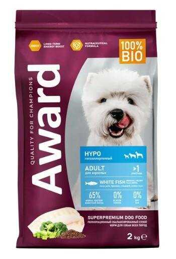 У меня французский бульдог, аллергик. Два года подбирали питание, от натуралки до кормов. Корма от супер премиум класса до среднего. Бывало корм вроде подошел, но через 1-2 месяца начинались проблемы. Авард подошел прекрасно, больше года только на нем, и только на белой рыбе. Мы с псином довольны)))