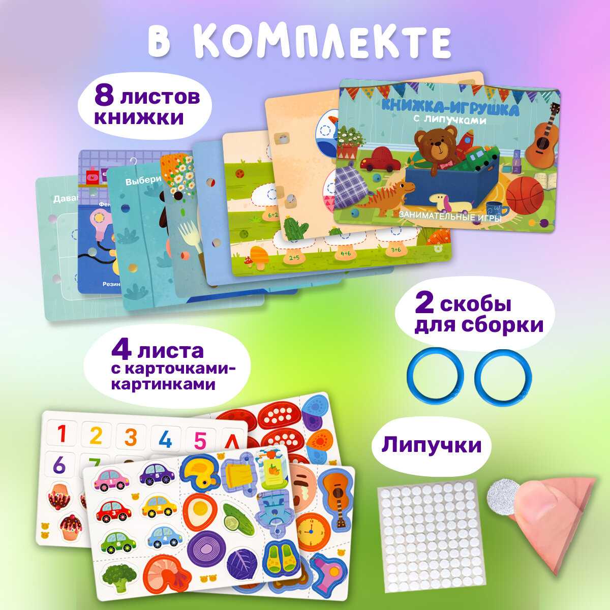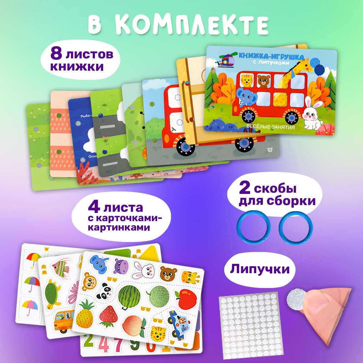 Комплектация : | 8 листов книжки, 4 листа с карточками-картинками, 2 скобы для сборки книжки и липучки. |