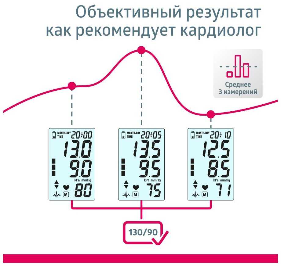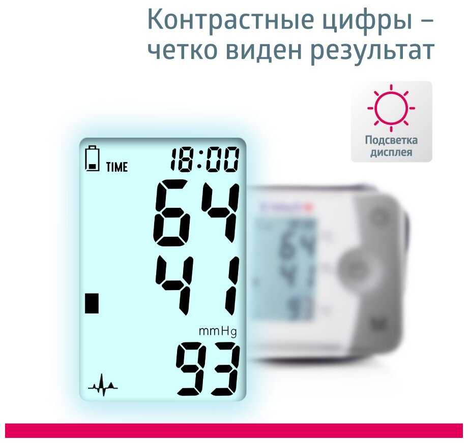 Процесс измерения занимает не более 1 минуты. Показания отображаются на одном экране: верхнее, нижнее давление, пульс.