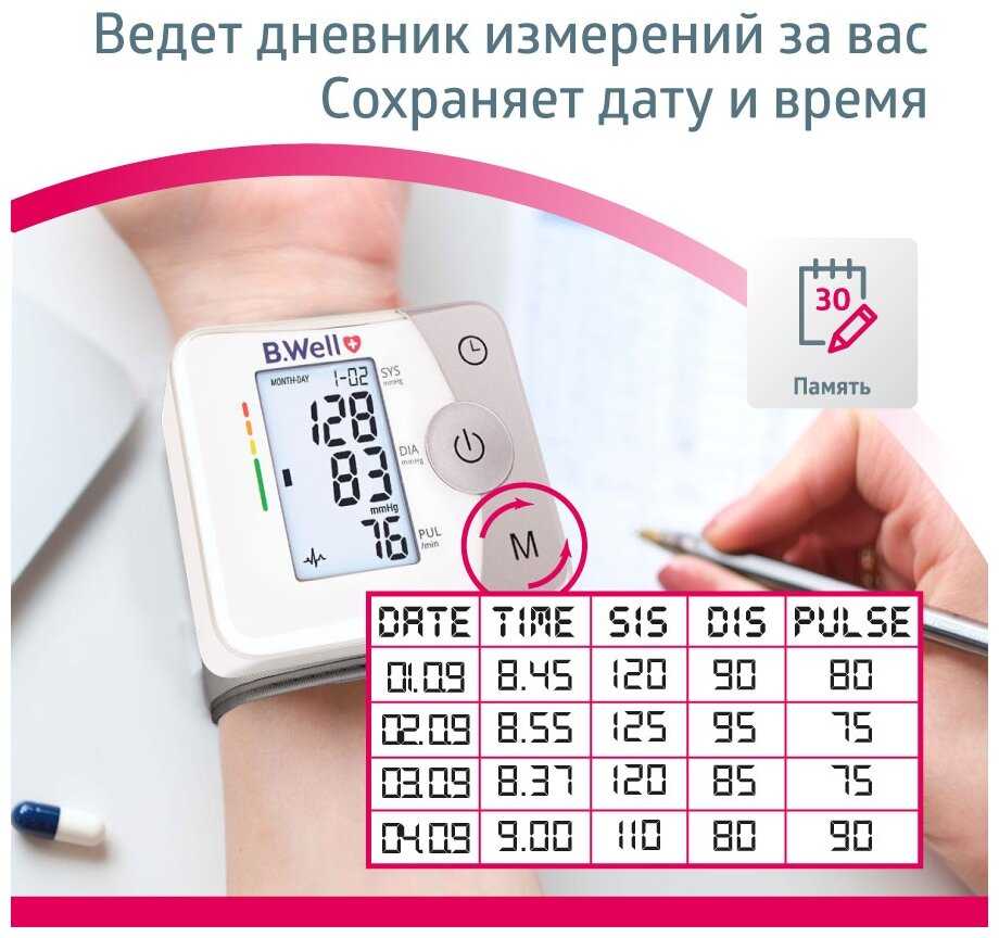 - Встроенная память на 30 измерений с отметкой даты и времени.