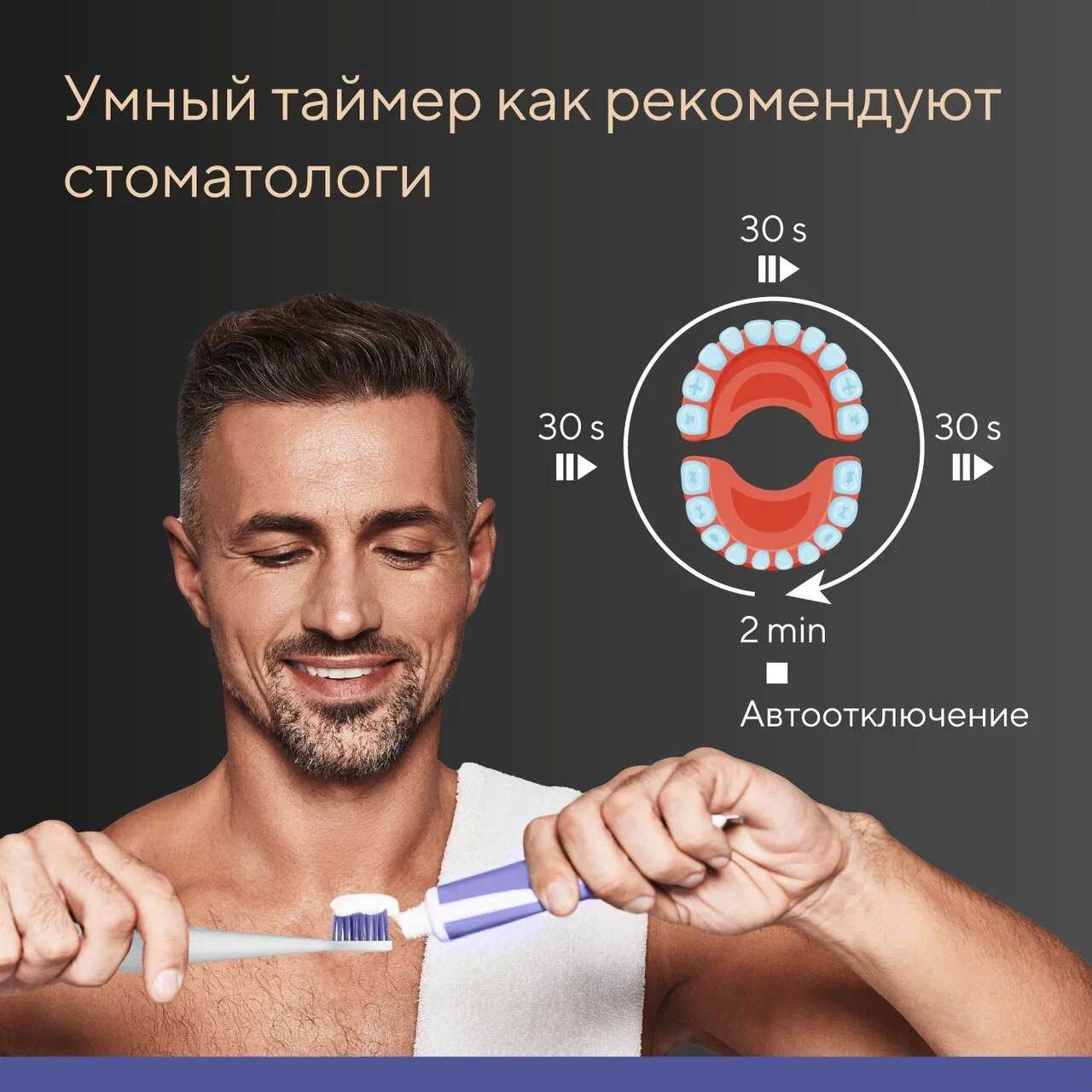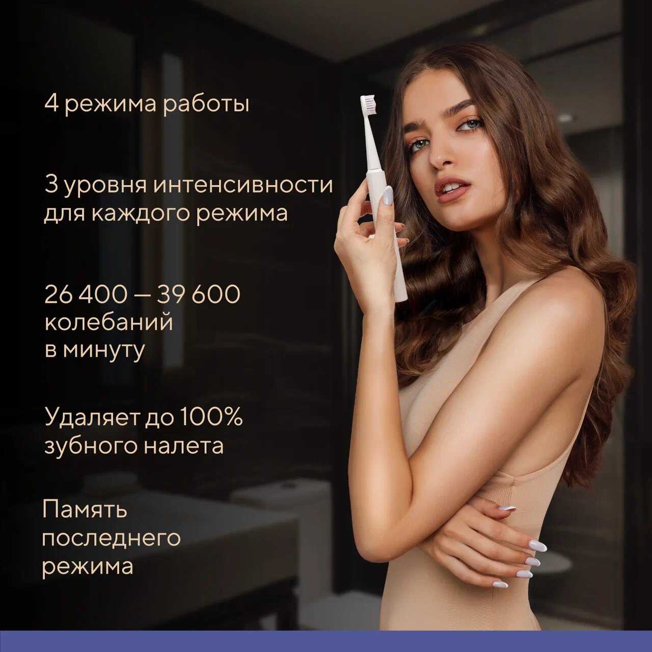 - 4 специализированных режима (ежедневный, сенситивный, массаж дёсен, отбеливание) с 3 уровнями интенсивности.