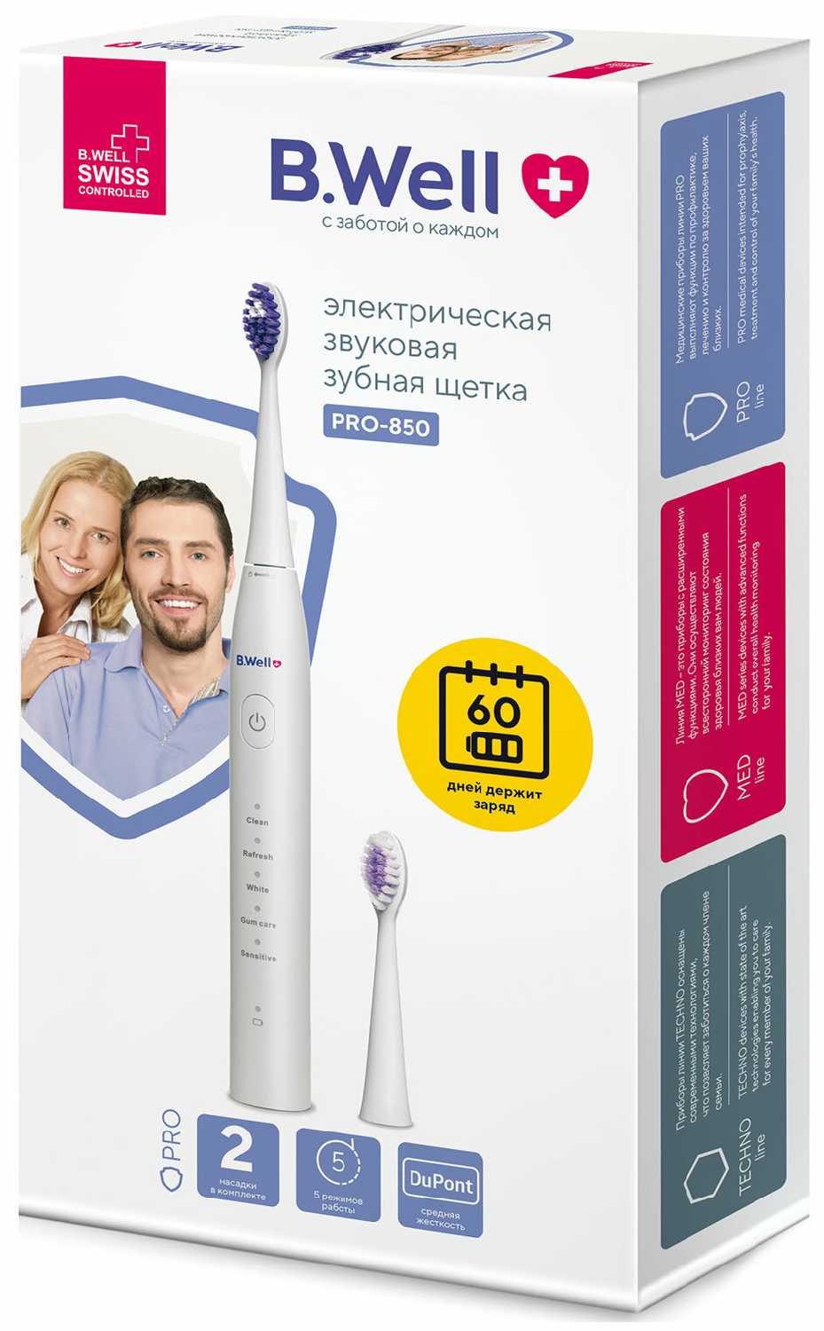 Отзывы о Электрическая зубная щетка B.Well PRO-850, звуковая, 5 режимов, 2 насадки