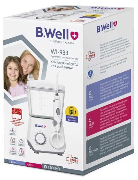 - + Мне пришлось реставрировать зубы с помощью металлических конструкций. Доктор в стоматологии посоветовал приобрести ирригатор для ухода за зубами в моей ситуации.После изучения различных моделей и производителей, решила остановиться на модели B.Well WI-933. Это стационарный ирригатор для ухода за зубами для всей семьи. При относительно небольшой стоимости, он имеет массу возможностей и преимуществ. Большая мощность, плавное переключение, детский режим, 3 основных насадки для всех членов семьи и большое количество дополнительных насадок для различных видов чистки зубов и языка. Также мне понравился большой резервуар для воды, которого хватает на всех. В общем, прибор суперский. Ни разу не пожалела, что купила именно его. Не думала, что даже после тщательной чистки обычной щëткой можно из зубов извлечь ещё что-то, оказывается, можно. Вы увидите это сами, если приобретëте ирригатор.