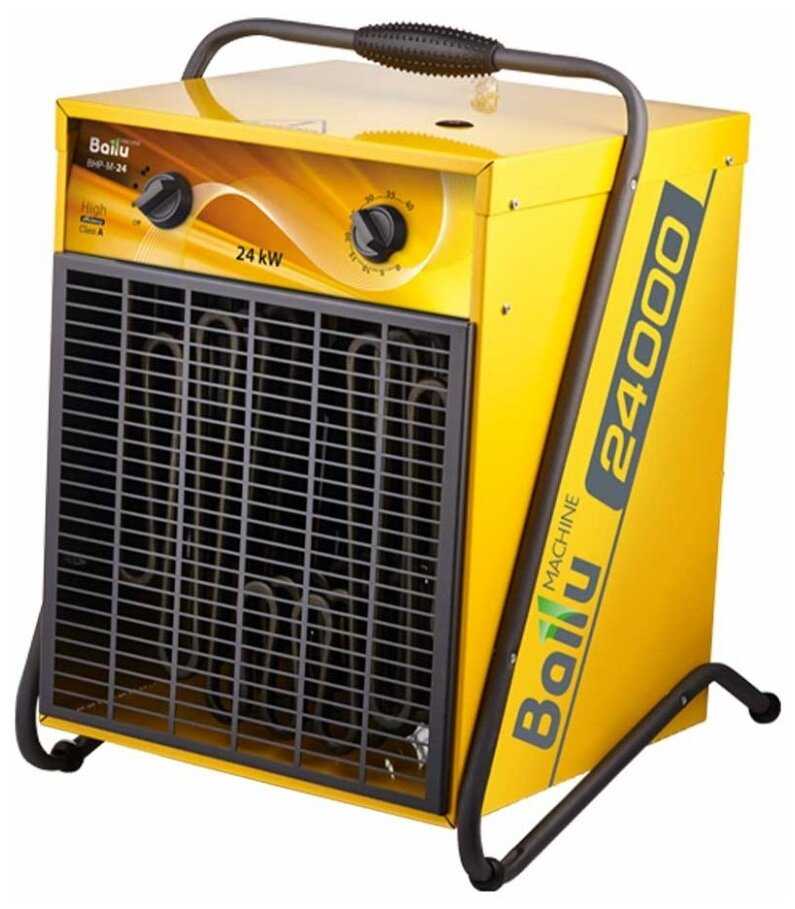 - Мощность 24 кВт позволяет прогревать ангары, склады и цеха площадью до нескольких сотен м² за 10-15 минут или пару часов даже в неотапливаемых пространствах с бетонными полами и тонкими стенами.