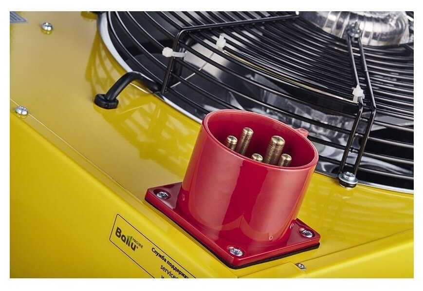 Пушка рассчитана на трехфазное подключение 380В (имеет встроенную трехфазную вилку или клеммы для кабеля). Для безопасного подключения требуется соответствующий силовой разъем и кабель сечением не менее 2.5 мм². Подключение должен выполнять квалифицированный электрик. Важно учитывать, что после отключения электроэнергии требуется ручной перезапуск прибора.