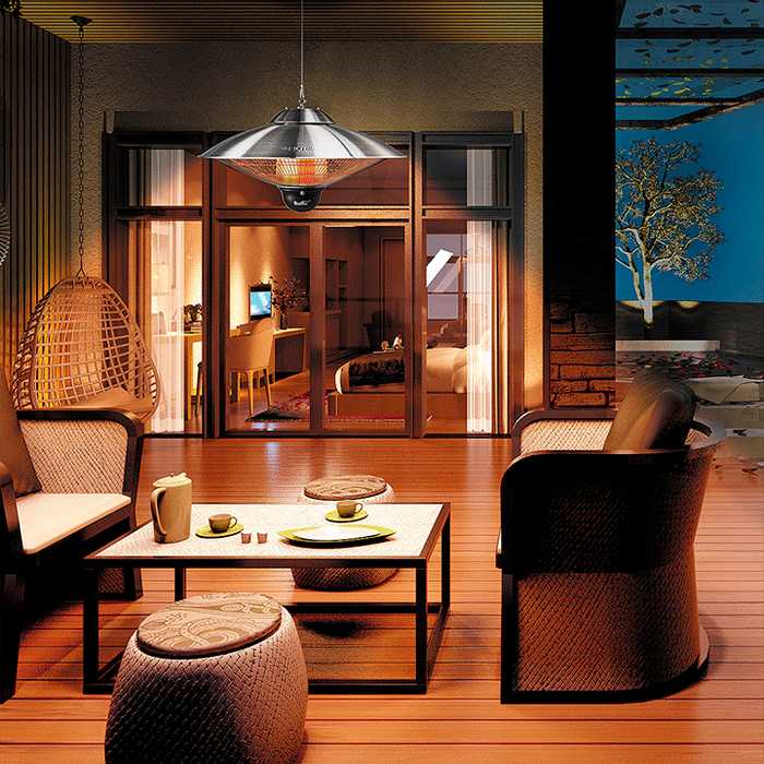 Пульт позволяет переключать три режима мощности, включать/выключать устройство без физического контакта. Это особенно ценится при групповом отдыхе: например, для регулировки нагрева во время ужина на террасе или приема гостей в беседке. Отсутствие необходимости подходить к обогревателю упрощает эксплуатацию в подвешенном состоянии. -