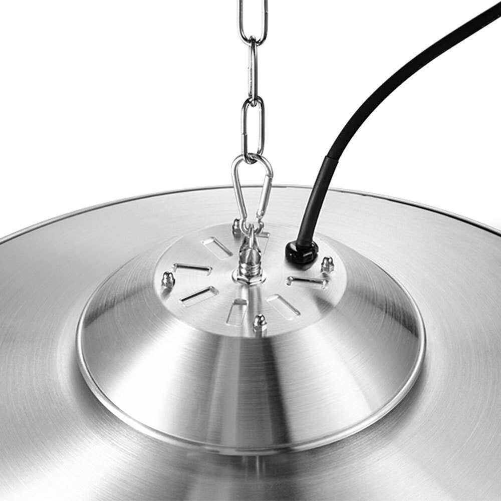 Обогреватель крепится на прочной металлической цепи, регулируемой по длине. Установка проста: достаточно потолочного крюка. Вес конструкции позволяет фиксацию на деревянных балках или легких навесах, но жесткий кабель питания требует близости розетки либо использования удлинителя с сечением провода не менее 2.5 мм². -