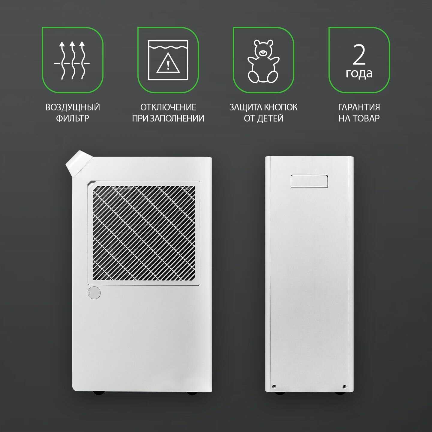 Особенности : | встроенный гигрометр, встроенный гигростат, дисплей, колёса, ручка для переноски |