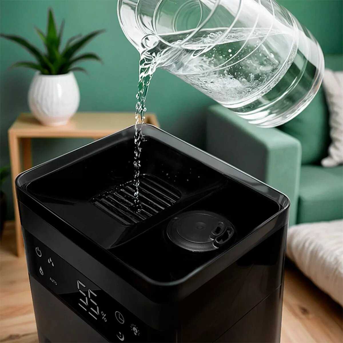 - + Хорошо увлажняет, удобный доступ к заливу воды, эстетичный, почти бесшумный, на панели хорошо видны параметры, простота в настройках, автоотключение при отсутствии воды