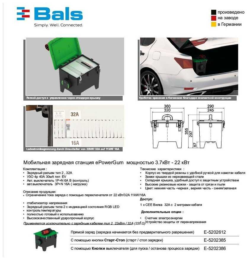 Характеристи Bals 32 А 22 КВТ для электромобиля