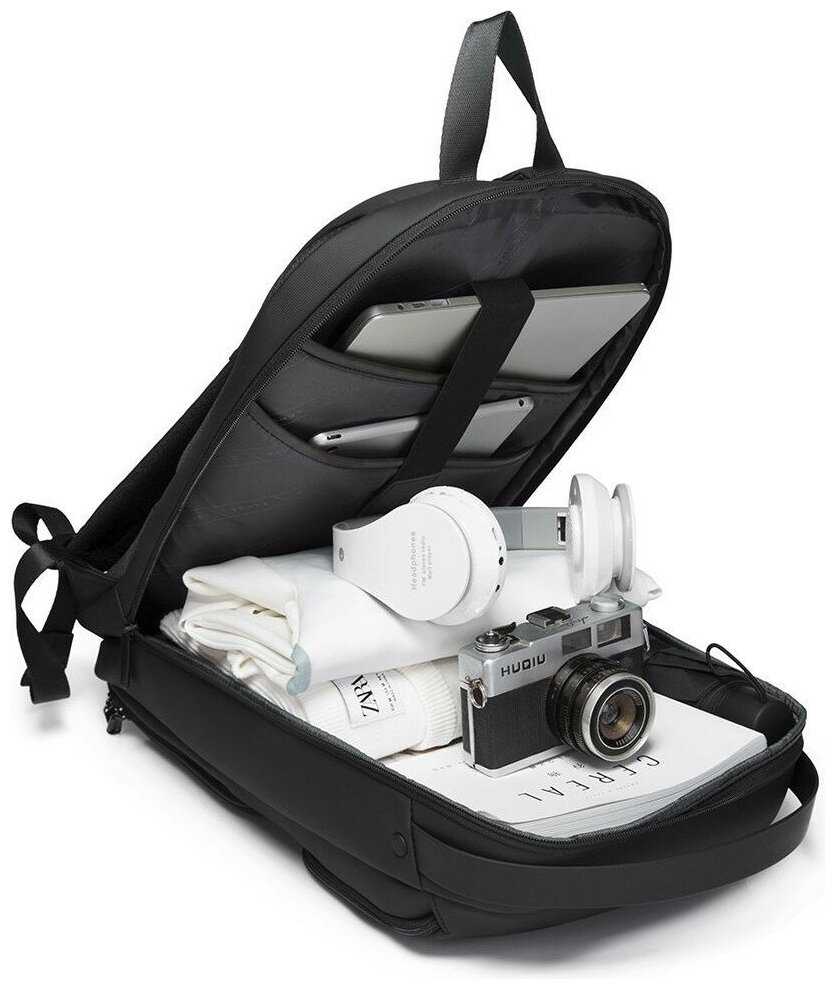Очень много отделений, кармашков, с лёгкостью вмещает 2 ноутбука, не теряя форму при этом