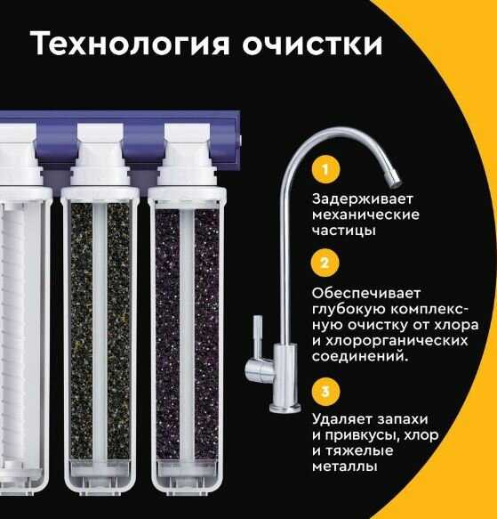 В комплекте 3 фильтра, фитинги, шланги, основание для установки и краник для фильтрованной воды (хороший, что приятно)