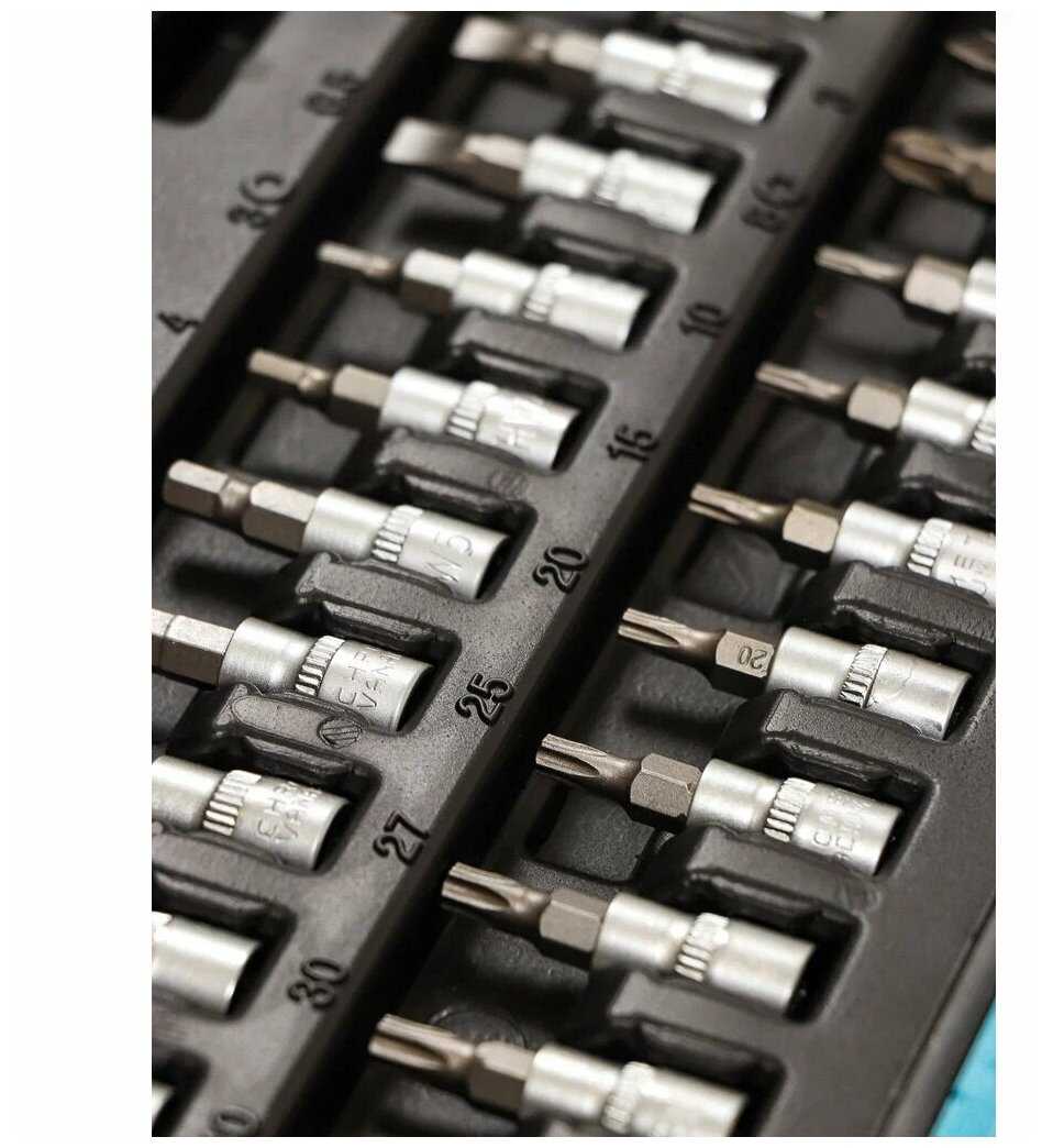 Головки торцевые подробно : | Набор включает в себя головки торцевые 1/4" следующих размеров: Е4 Е5 Е6 Е7 Е8 Е10. Также в комплект входят головки торцевые со вставкой S2 1/4" для различных типов крепежа: PH 1 2 3, SL 4 5.5 6.5, H 3 4 5 6 7 8 10, PZ 1 2 3, Т 8 10 15 20 25 27 30 40. Дополнительно в наборе имеются стандартные головки торцевые 1/4" размеров 4 4.5 5 5.5 6 7 8 9 10 11 12 13 14 а также удлиненные головки 6 7 8 10. Эти головки изготовлены из хромованадиевой стали что обеспечивает их долговечность и устойчивость к коррозии. |