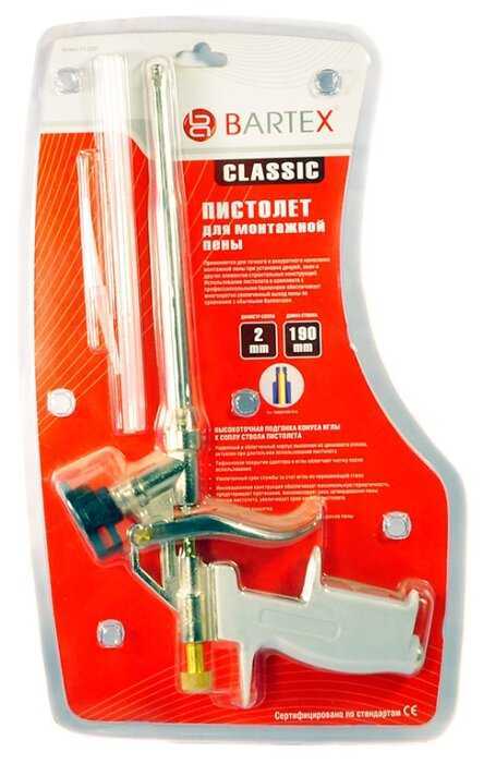 | Дополнительная информация : | тефлоновое покрытие препятствует прилипанию пены к металлическому корпусу, высокоточная подгонка конуса иглы к соплу ствола пистолета обеспечивает максимальную герметичность и предотвращает протекание, удобная рукоятка повышает степень комфорта мастера, пистолет для монтажной пены Bartex – это идеальный инструмент для быстрого, безопасного и точного заполнения щелей и пустот даже в труднодоступных местах, с помощью винта можно регулировать объем и скорость выхода пены, эргономичная форма изделия и легкий пуск курка обеспечивают надежный и удобный захват, не давая рукам устать даже при длительной нагрузке |