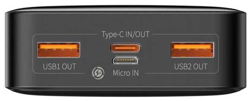 - 4 порта: 2×USB-A (5V/3A), 1×Type-C (вход/выход до 20W), 1×Micro-USB (вход).