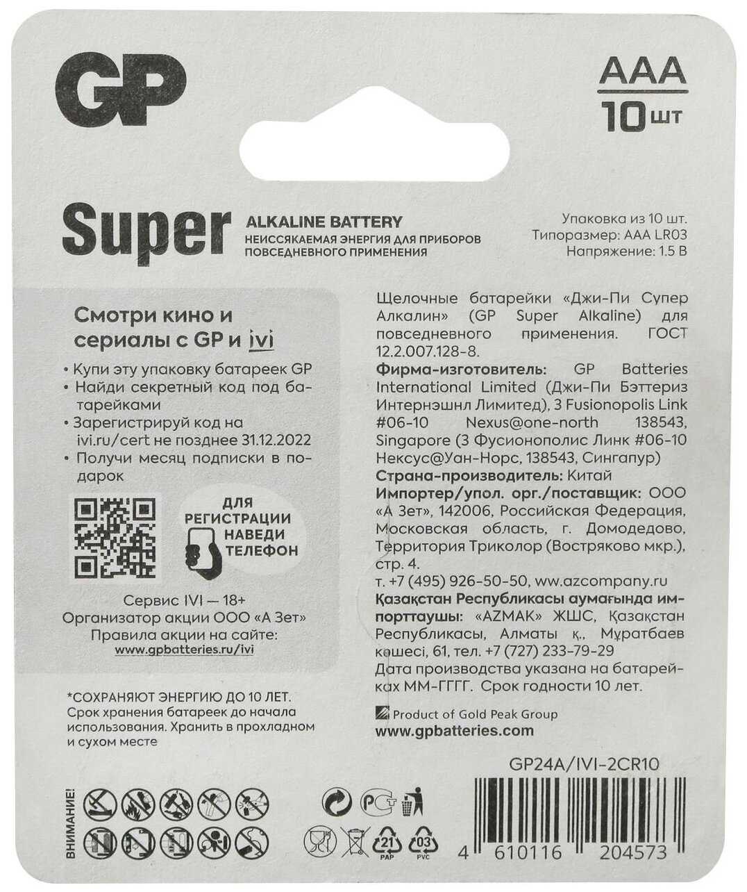 5.9/10 балловGP Super Alkaline 24A/IVI-2CR10 AAA (10шт) блистер
