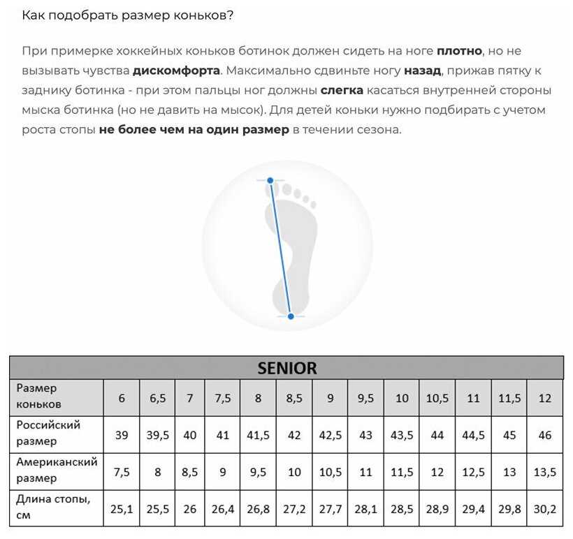 Размерная сетка Bauer отличается от привычных российских стандартов: например, 11 размер соответствует 46 российскому. Многие пользователи отмечают, что коньки могут большемерить, поэтому рекомендуется брать на размер меньше обычного. При примерке на два носка посадка становится оптимальной — без сдавливания, но с плотной фиксацией стопы. Для точного выбора стоит сверяться с таблицей бренда, так как линейки разных моделей могут иметь отличия. -