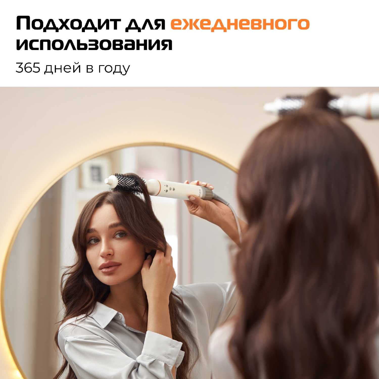 - В комплект входят специализированные насадки (брашинг, конус для локонов, расческа), позволяющие создавать разнообразные укладки без дополнительных инструментов.