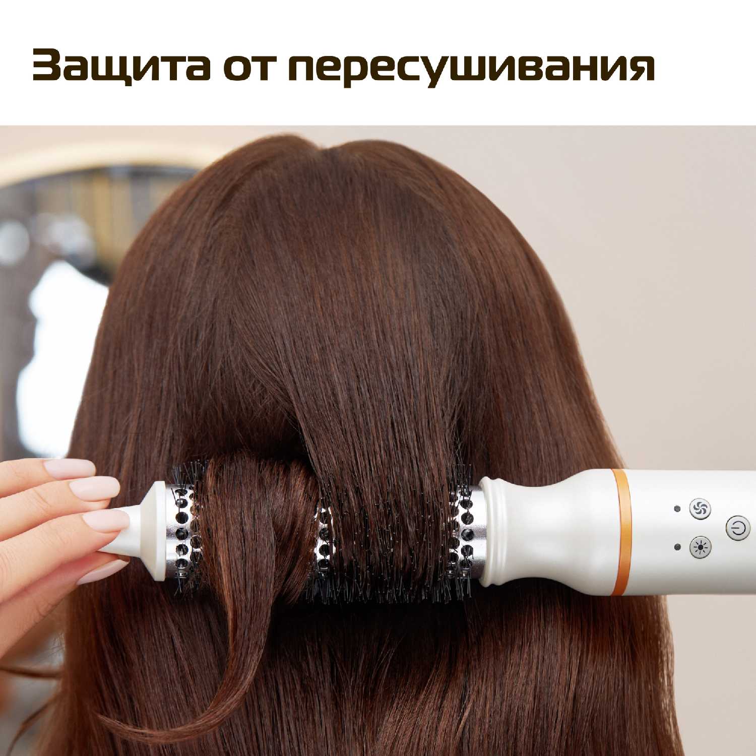 - В комплект входят специализированные насадки (брашинг, конус для локонов, расческа), позволяющие создавать разнообразные укладки без дополнительных инструментов.