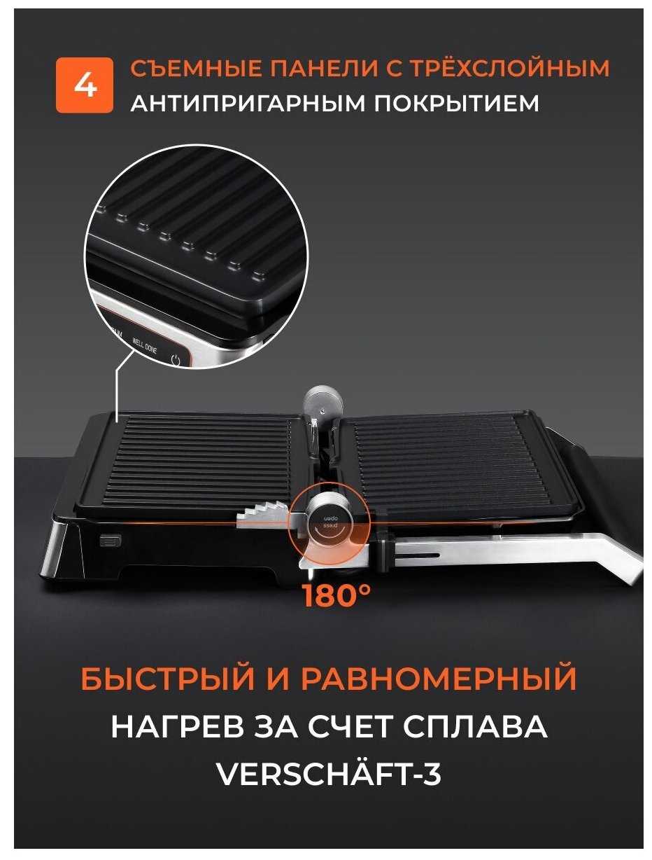 - В базовой поставке — 4 съемные панели (рифленые, плоские), термощуп и книга рецептов. Дополнительно доступны панели для вафель.
