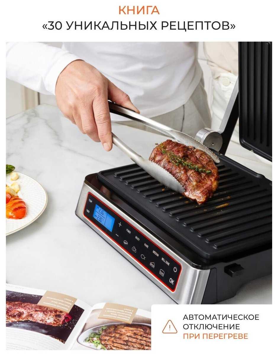 Термощуп обеспечивает точный контроль прожарки стейков — при достижении заданной температуры гриль подает сигнал. Пользователи подтверждают, что это исключает пересушивание мяса, но советуют сверяться с практикой: время в рецептах из книги требует индивидуальной корректировки. -