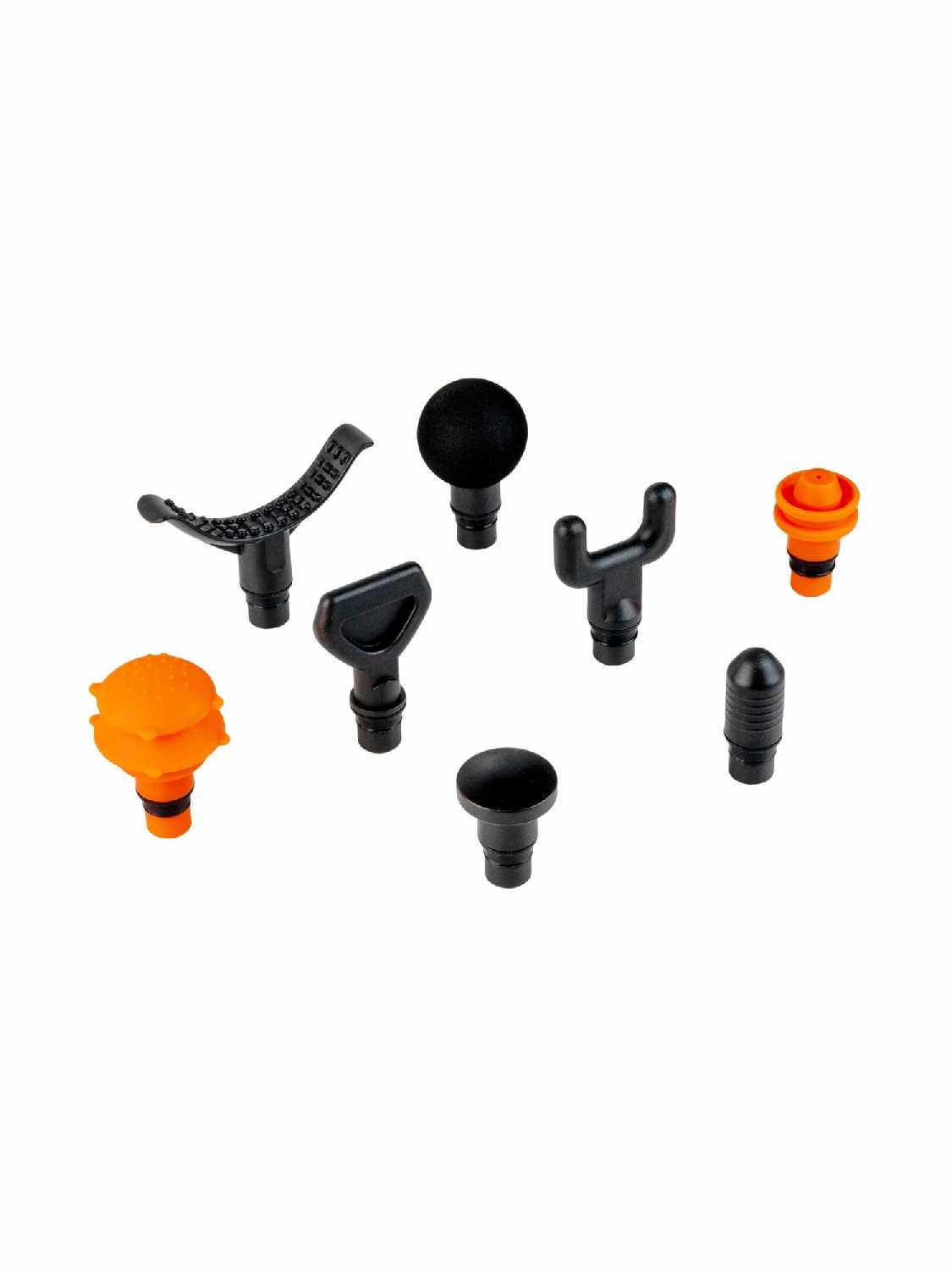 - В комплект входит множество специализированных насадок, включая резиновые и полукруглые, для различных типов массажа и воздействия на разные группы мышц.