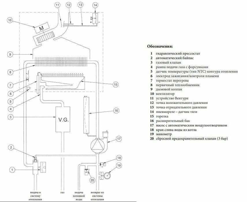 Особенности : | воздухоотводчик, встроенный расширительный бак, встроенный циркуляционный насос, манометр, предохранительный клапан, разъем для подключения внешнего управления, термометр |