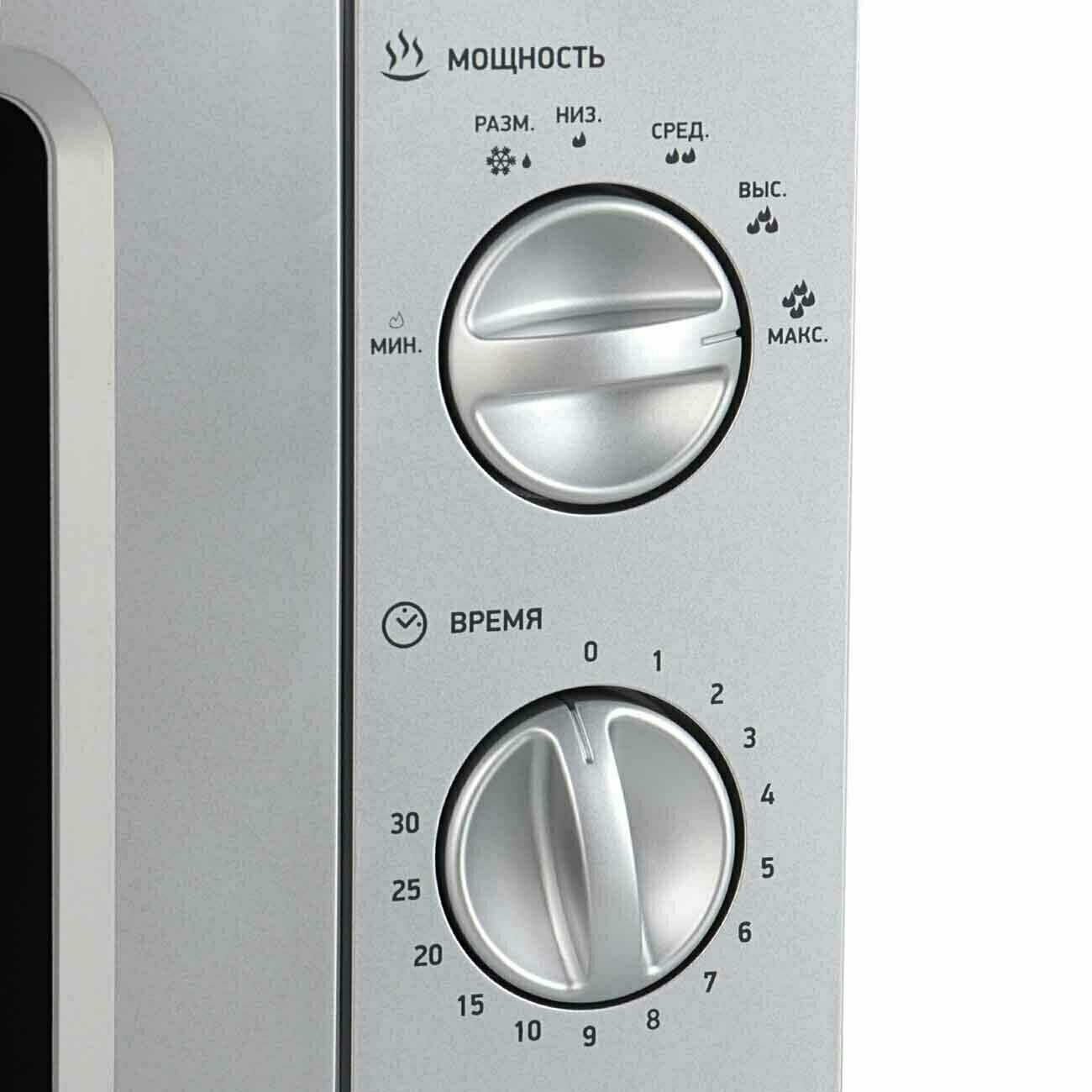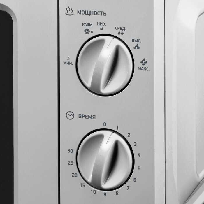 Механическое управление двумя крутилками обеспечивает простоту и интуитивность использования. Отсутствие сложных электронных меню снижает риск поломок и упрощает эксплуатацию для всех возрастных групп. Такая конструкция особенно удобна при частом разогреве пищи, когда требуется быстро установить время и мощность. -