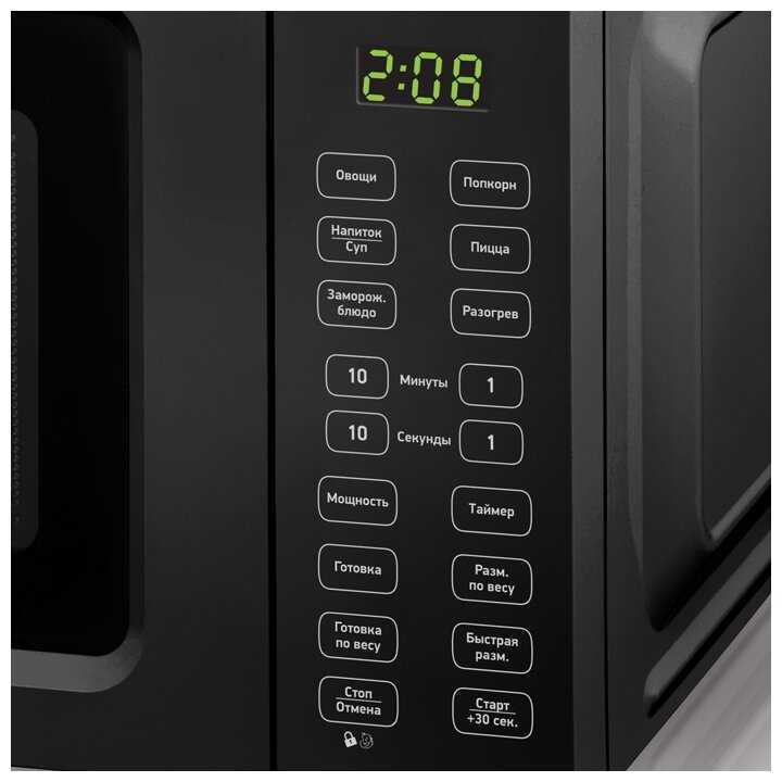 - Маркировка на русском языке упрощает выбор режимов (разморозка, средняя/максимальная мощность).