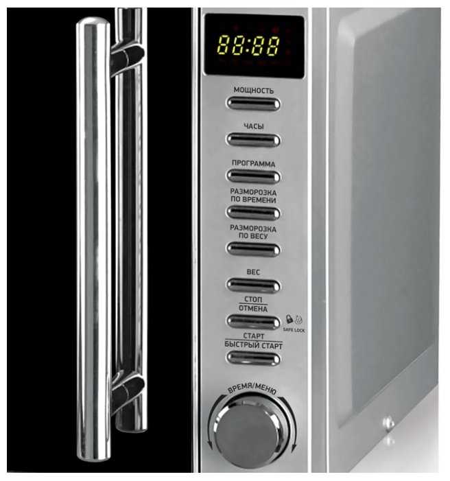 Дисплей цифровой. Микроволновка очень мощная. Подогревает еду быстро. Есть функция разморозки, часто пользуюсь, так как постоянно забываю достать что-то из морозилки и ждать естественной разморозки обычно долго. Здесь можно выбрать разморозку по весу или времени. Размораживает достаточно равномерно. Очень объемная внутри, помещается большой пластиковый контейнер даже. Зеркальная дверца меня не напрягает, я часто ее протираю, также как и все остальное на кухне, но смотрится очень эффектно.