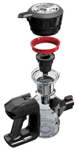 - Контейнер объёмом 0,6 л можно мыть под проточной водой, а выброс мусора осуществляется нажатием кнопки без контакта с пылью.