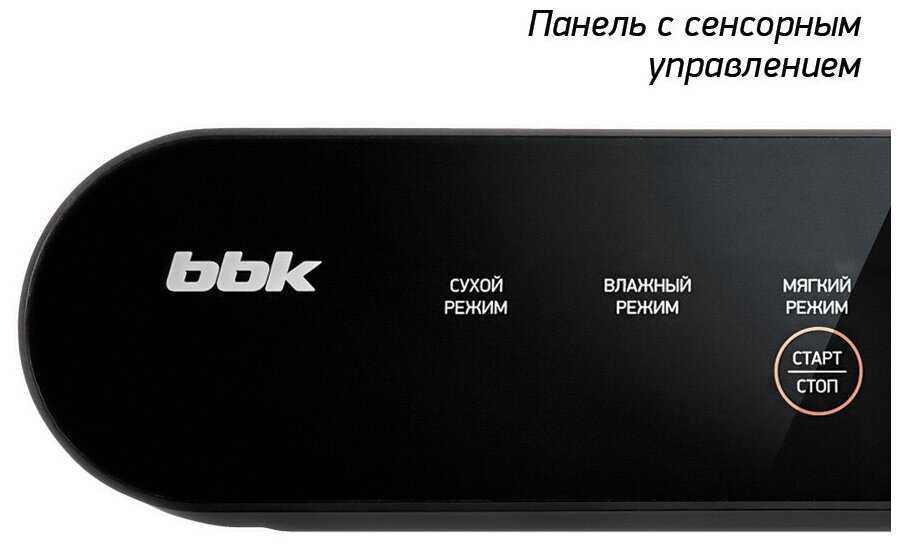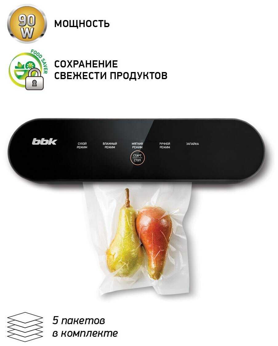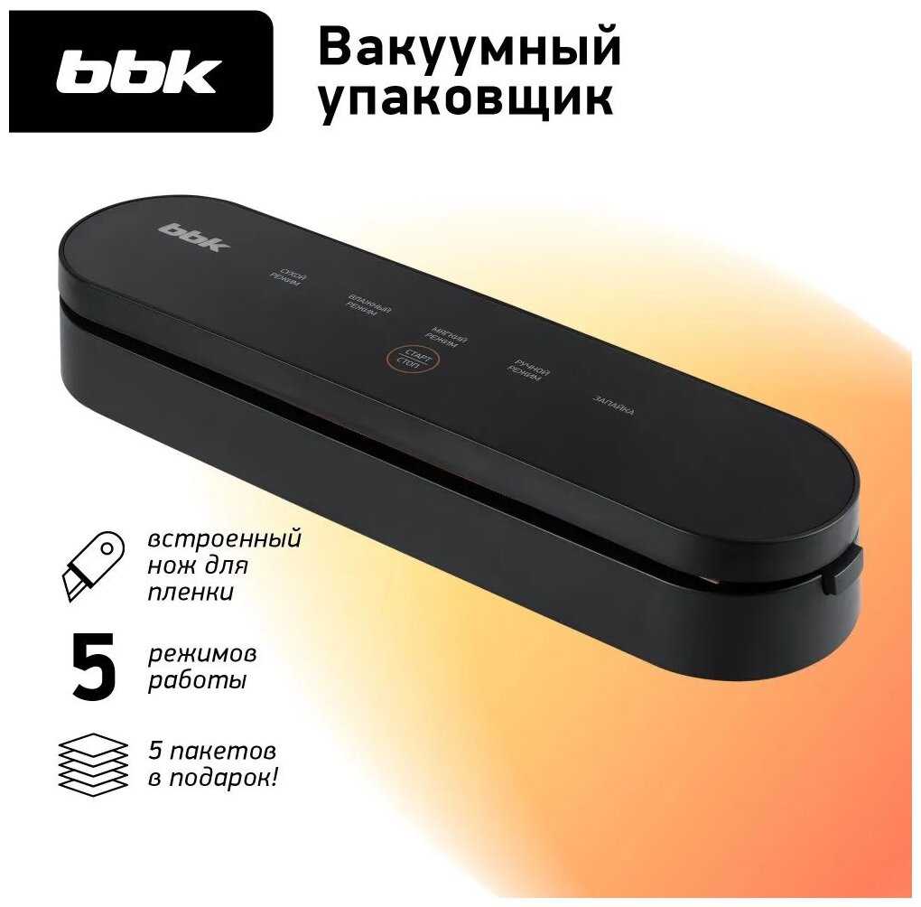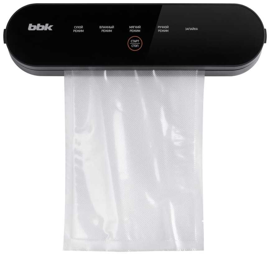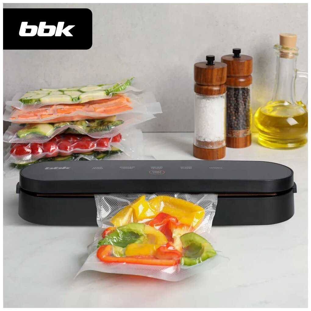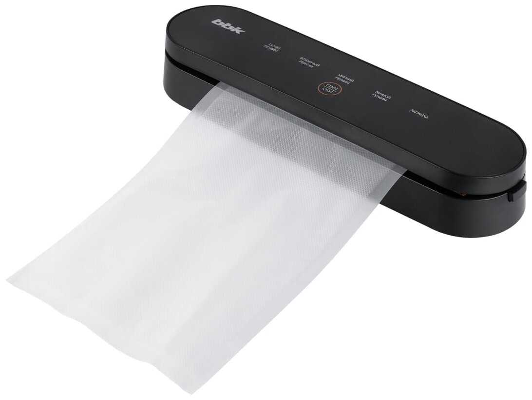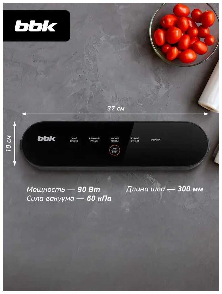 Максимальная ширина рулона или пакета — 30 см. Комплектные пакеты (5 шт.) часто критикуют за низкое качество (воздух быстро проникает обратно), поэтому пользователи рекомендуют сразу покупать фирменные рулоны BBK с двусторонней текстурой (гладкая + пупырчатая сторона). Они обеспечивают надежную герметизацию и легко отрезаются встроенным ножом. -