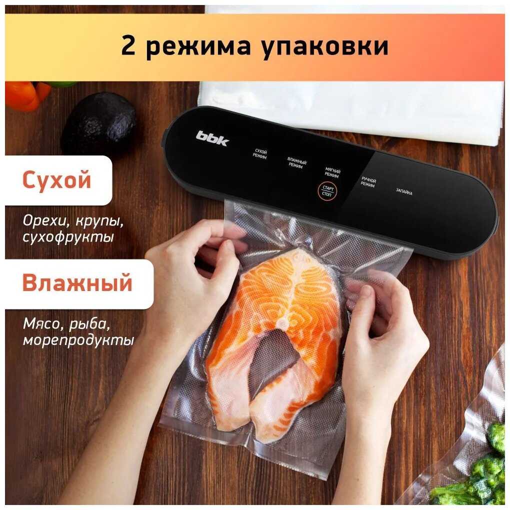 Устройство оптимально для домашнего консервирования: увеличение срока хранения замороженных продуктов до 12 месяцев без смешивания запахов подтверждено тестами с мясом и овощами. Идеален для подготовки порционных обедов (например, упаковка ингредиентов для винегрета школьнику) и маринования шашлыка — ручной режим позволяет точно дозировать вакуумирование сочных продуктов. Не рекомендован для профессионального использования из-за ограниченной производительности. Важный лайфхак: для упаковки рыбы и сочных фруктов следует класть на дно пакета бумажную салфетку, впитывающую избыток влаги. Пользователи советуют сразу приобретать фирменные рулоны BBK с текстурой "пупырка+гладкий слой", так как комплектные пакеты признаны некачественными.