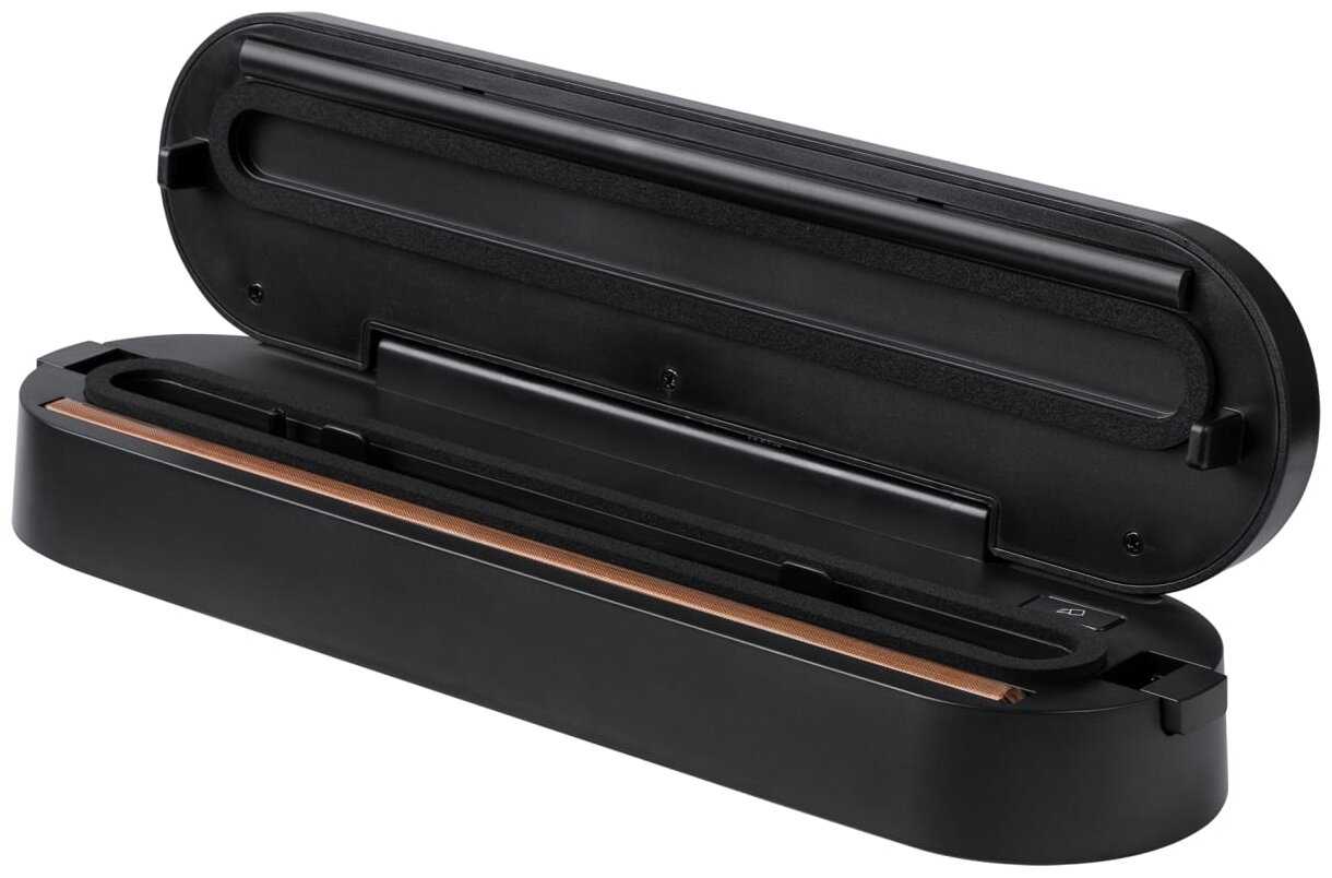 Инновационная система боковых защелок, фиксирующихся внутрь корпуса, обеспечивает исключительную герметичность рабочей камеры — пользователи отмечают "идеальный шов без складок". Однако новичкам требуется усилие для закрытия: необходимо последовательно надавливать на каждую защелку до щелчка, что поначалу вызывает трудности. Глянцевая поверхность панели легко очищается, но быстро покрывается отпечатками пальцев. Встроенный резак для пакетов расположен внутри отсека, что защищает его от потери, но усложняет оперативный доступ. Съемный сетевой кабель длиной 1.5 метра признан удобным для мобильного хранения, а компактные габариты позволяют разместить устройство даже в тесных кухонных шкафах.
