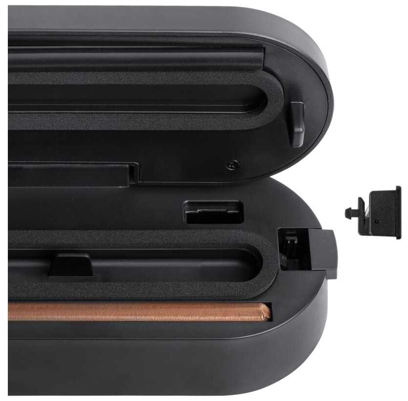 - Встроенный резак для пакетов и отсек для хранения аксессуаров эргономично интегрированы в конструкцию.