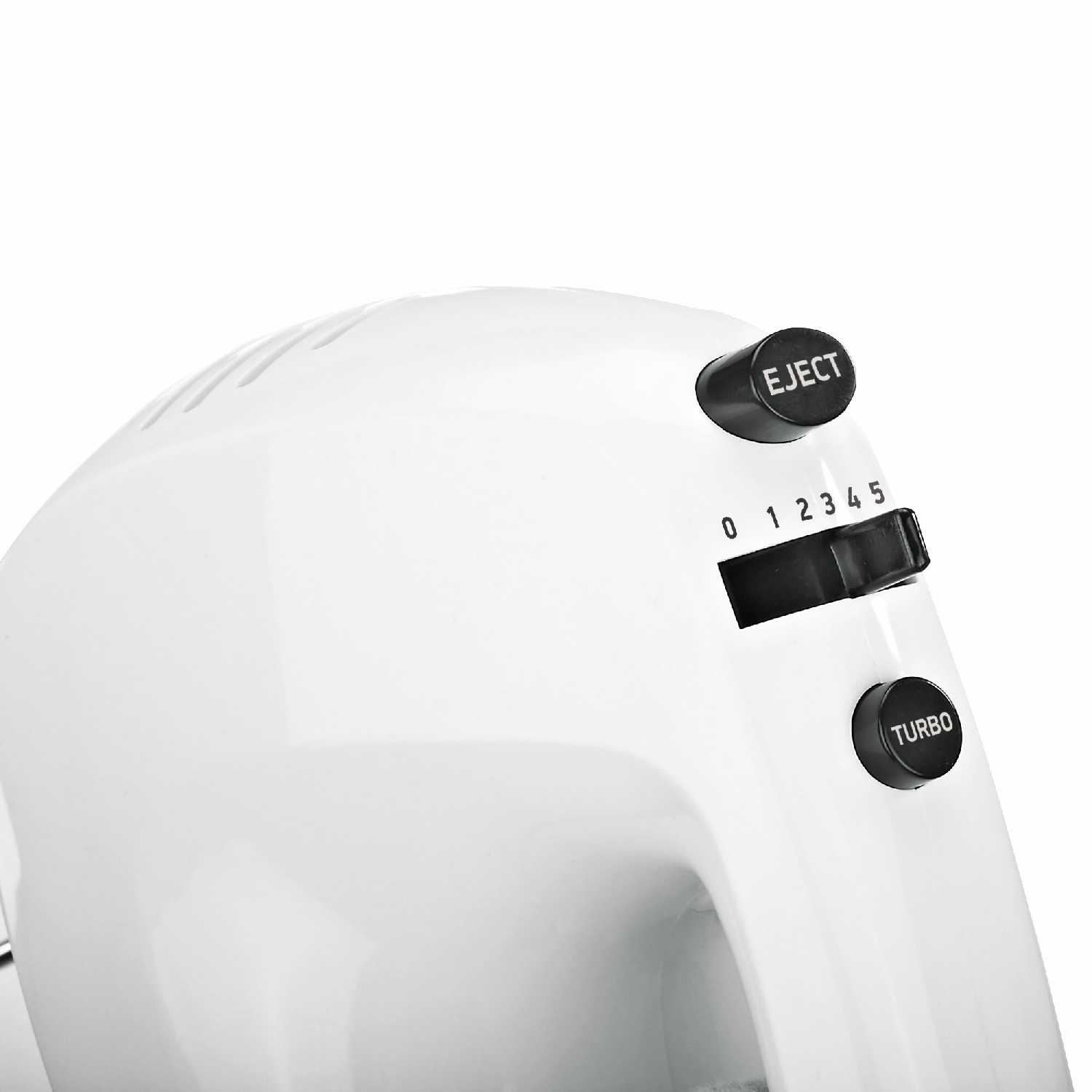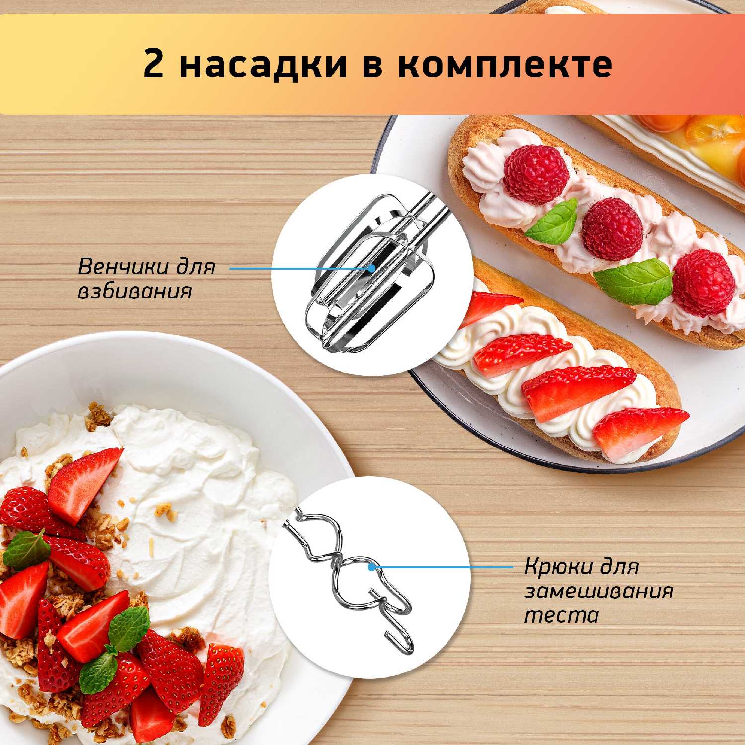 - + компактный, шустрый! очень понравился, да ещё и за такие деньги. в комплекте венчики для взбивания жидкого и густого теста. Маленький, но увесистый.