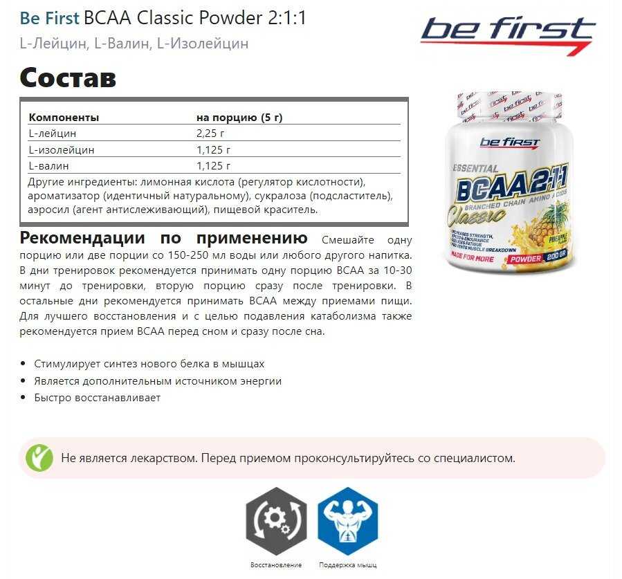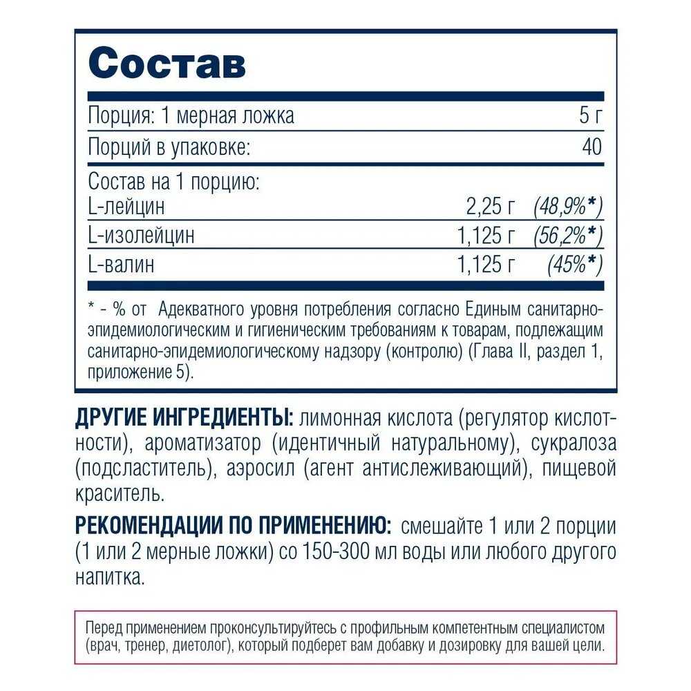 - Технический параметр: оптимальная пропорция лейцина, изолейцина и валина (стандарт BCAA 2:1:1) ускоряет регенерацию мышечных волокон.