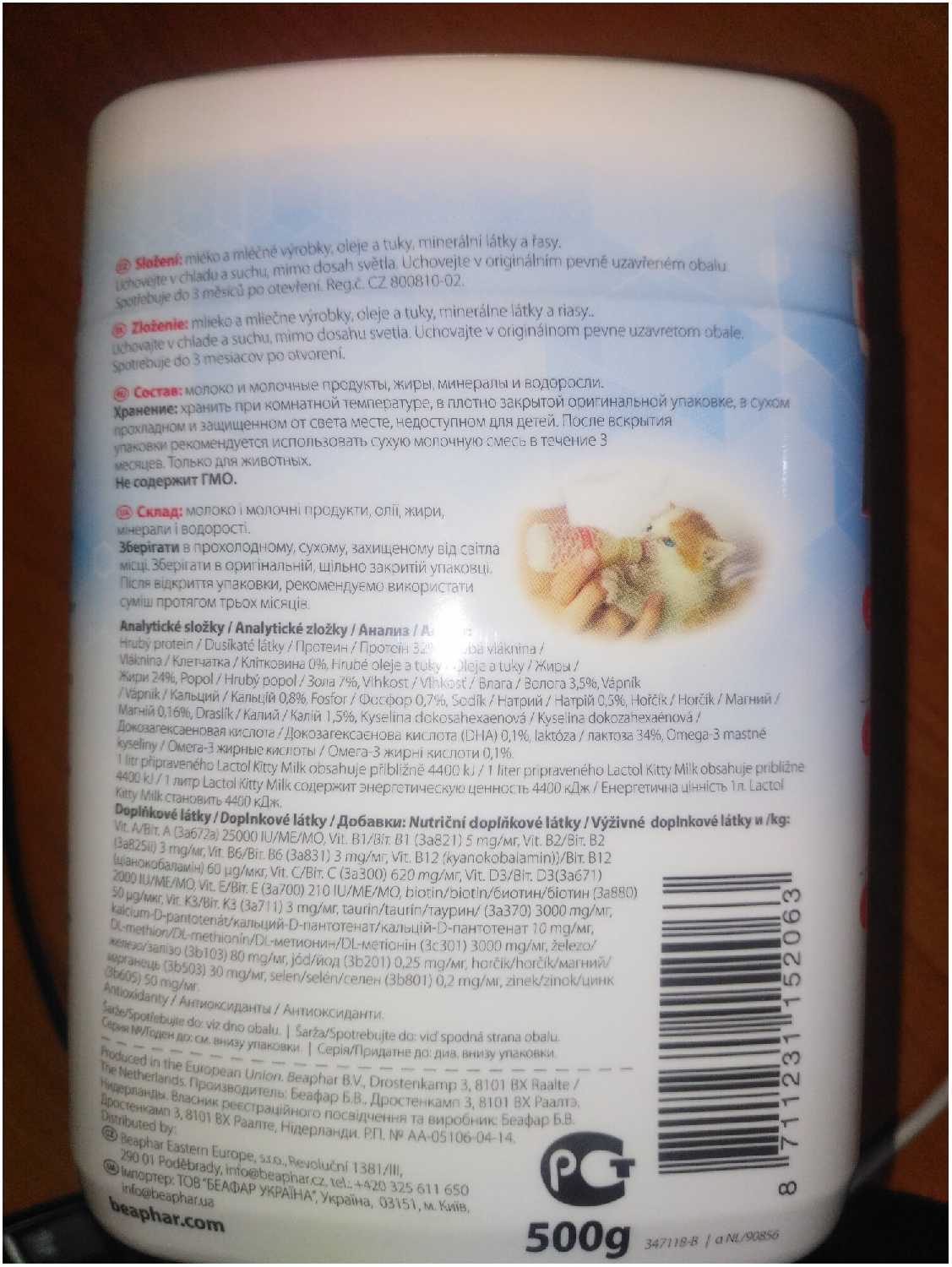 Употребляли смесь почти два месяца (не совсем по схеме производителя), храня в холодильнике саму упаковку. - - Немного сложная схема приготовления смеси, мой котенок не совпадал по весу и возрасту в таблице, поэтому разводили примерно. Отчего первое время был запор, но потом все нормализовалось.