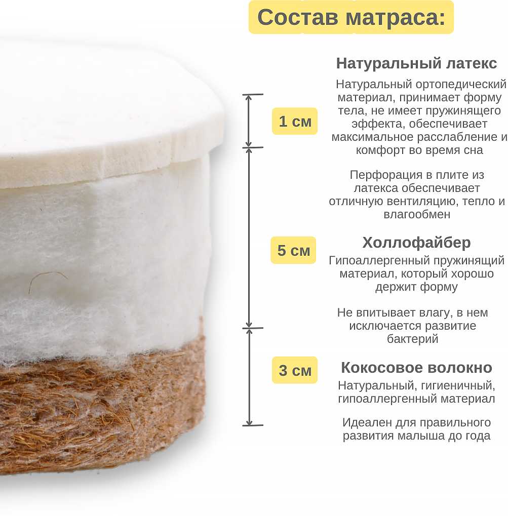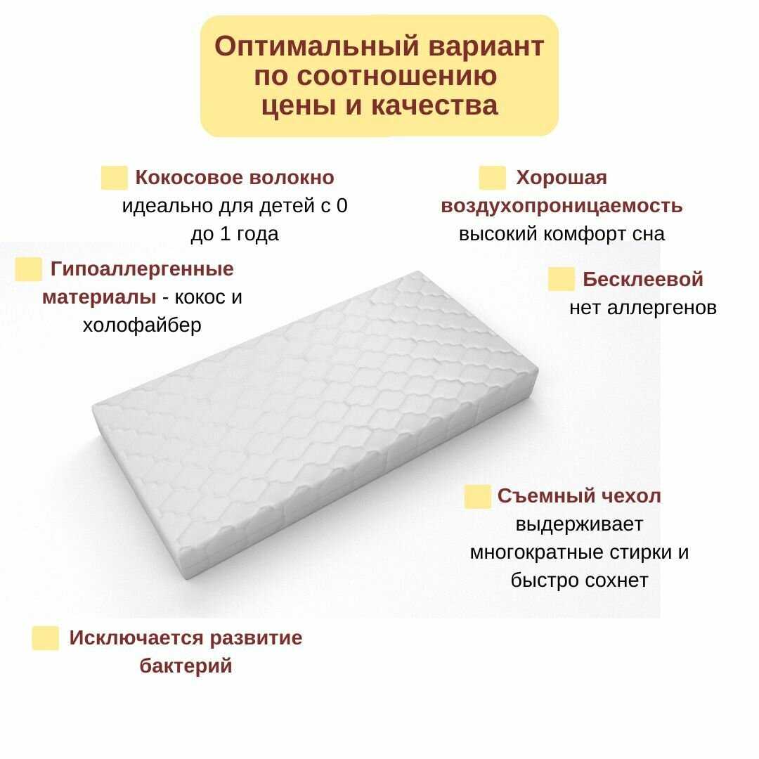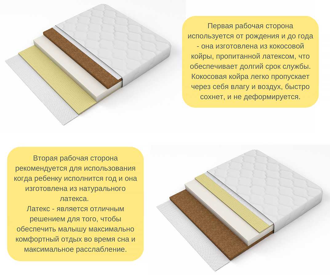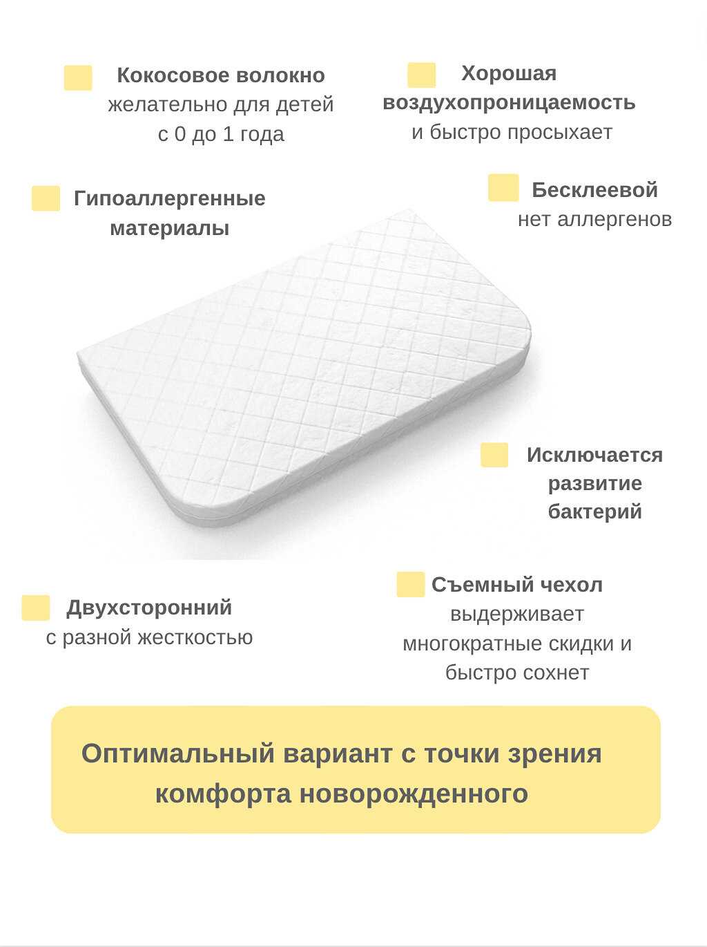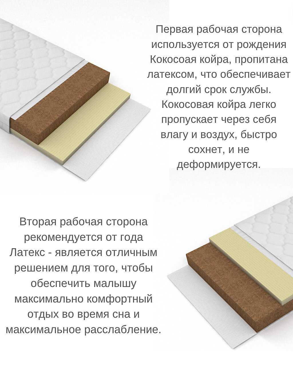 - Сторона с кокосовой койрой обеспечивает ортопедическую жесткость, критичную для правильного развития позвоночника младенцев до 1 года.