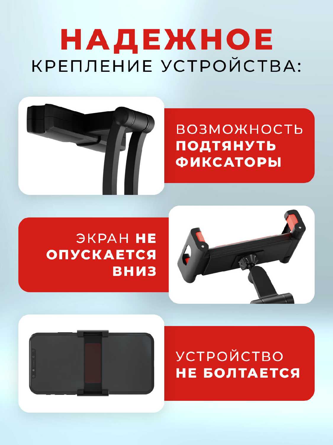 - + Надёжно крепится к креслу, надёжно держит планшет/телефон, много вариантов изгиб- можно как удобно отрегулировать положение поаншета/смартфона