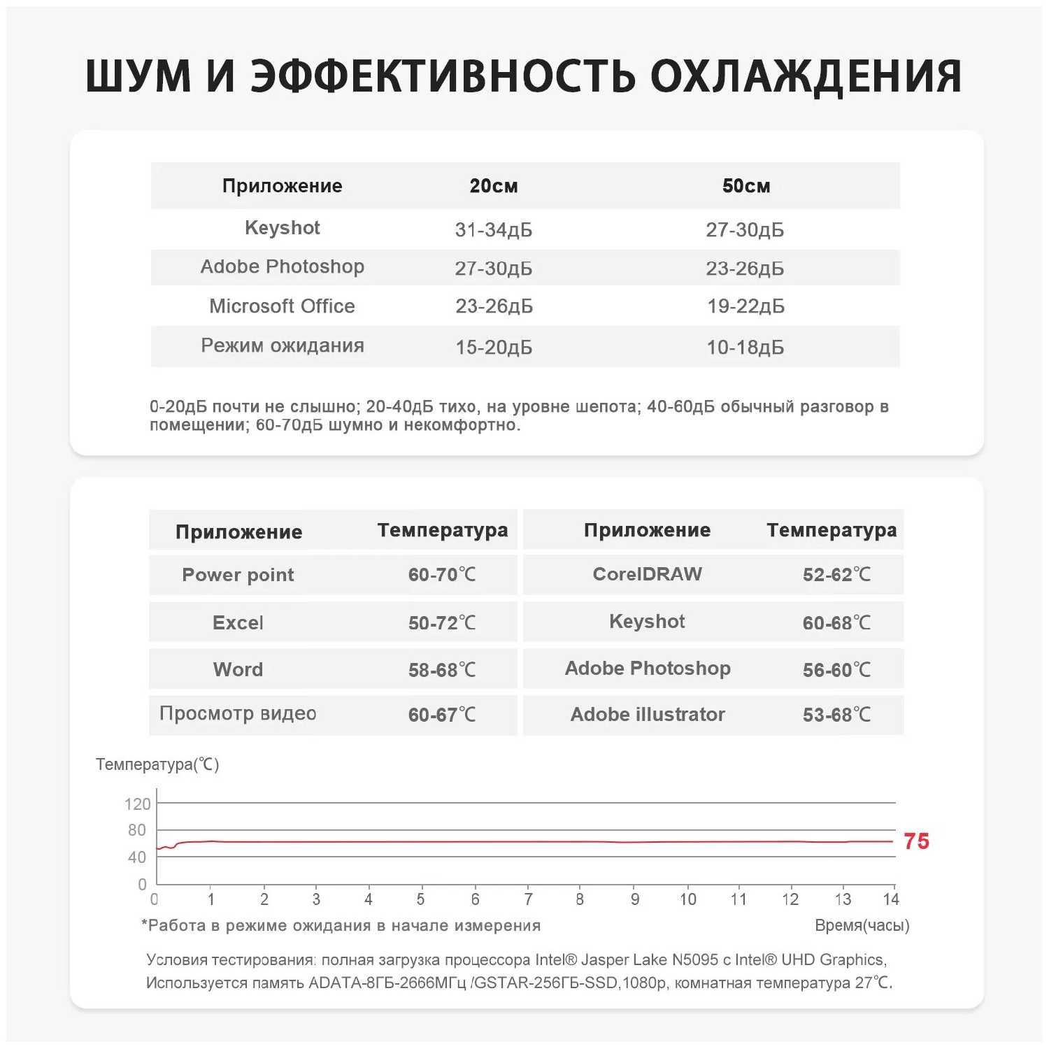 Устройство демонстрирует стабильную производительность в офисных задачах: без проблем справляется с браузерами (даже при 50+ вкладках), видеоконференциями, документами в Microsoft Office/LibreOffice. Видеоредакторы и Photoshop работают удовлетворительно, а воспроизведение 4K-контента с YouTube или локальных носителей осуществляется плавно. Однако ресурсоёмкие операции вроде рендеринга видео или запуска современных игр недоступны — процессор Intel N5095 ограниченно обрабатывает сложные сборки в CAD-программах типа Compass-3D. При одновременной работе нескольких тяжёлых приложений (например, CorelDRAW + Photoshop + потоковое видео) наблюдаются кратковременные подтормаживания.