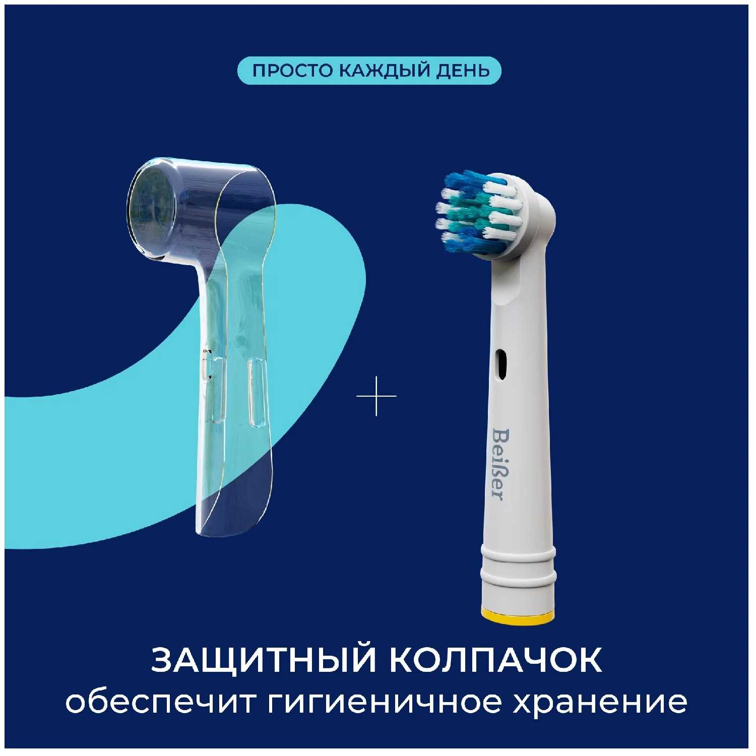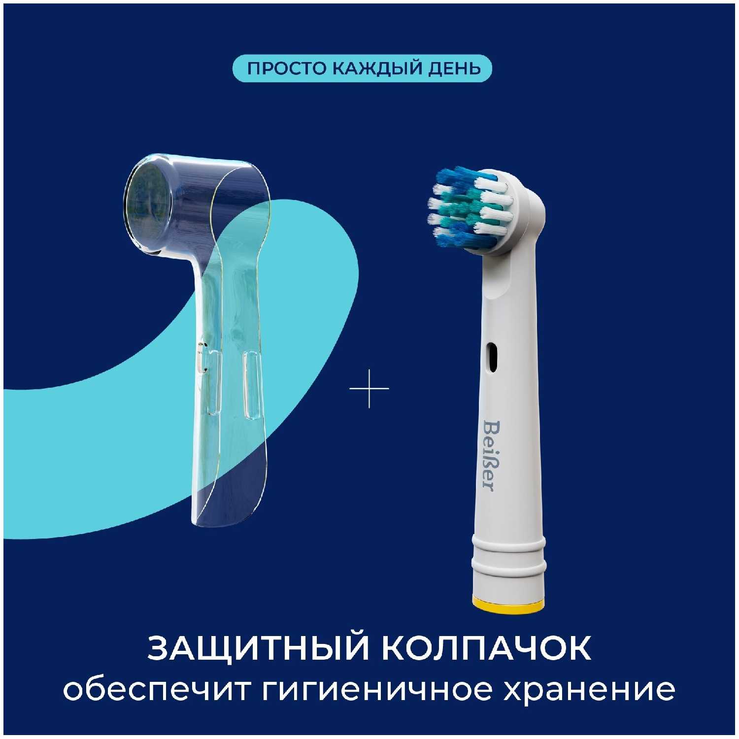 - Колпачки из качественного пластика предотвращают накопление пыли и бактерий на щетине, поддерживая санитарное состояние насадки.