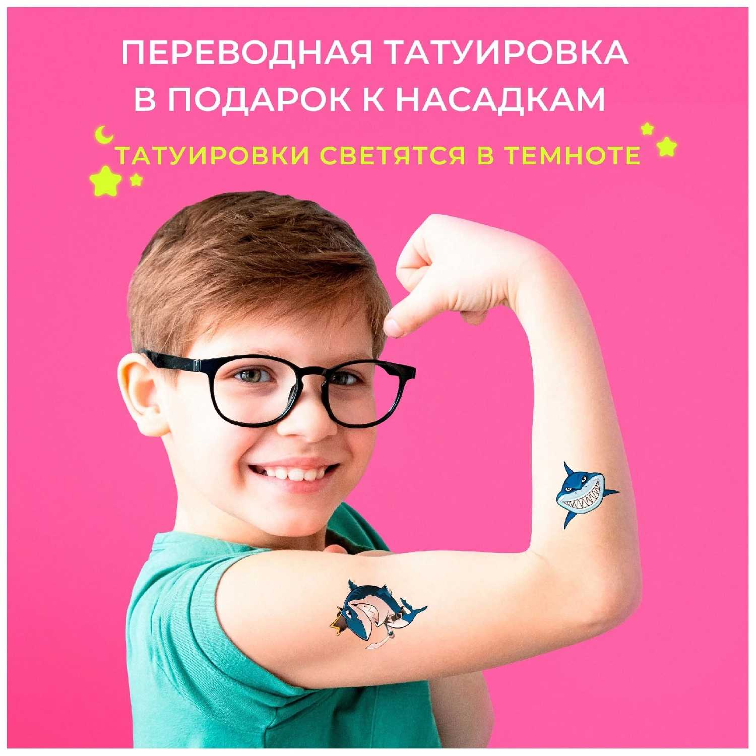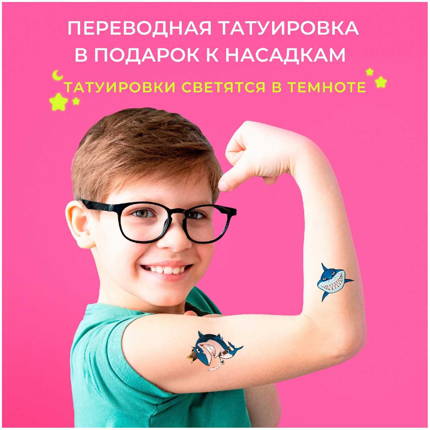 Да, часто в набор добавляются светящиеся наклейки-тату («акулы», «динозавры»). Дети воспринимают их как бонус, что мотивирует к регулярной чистке зубов. -