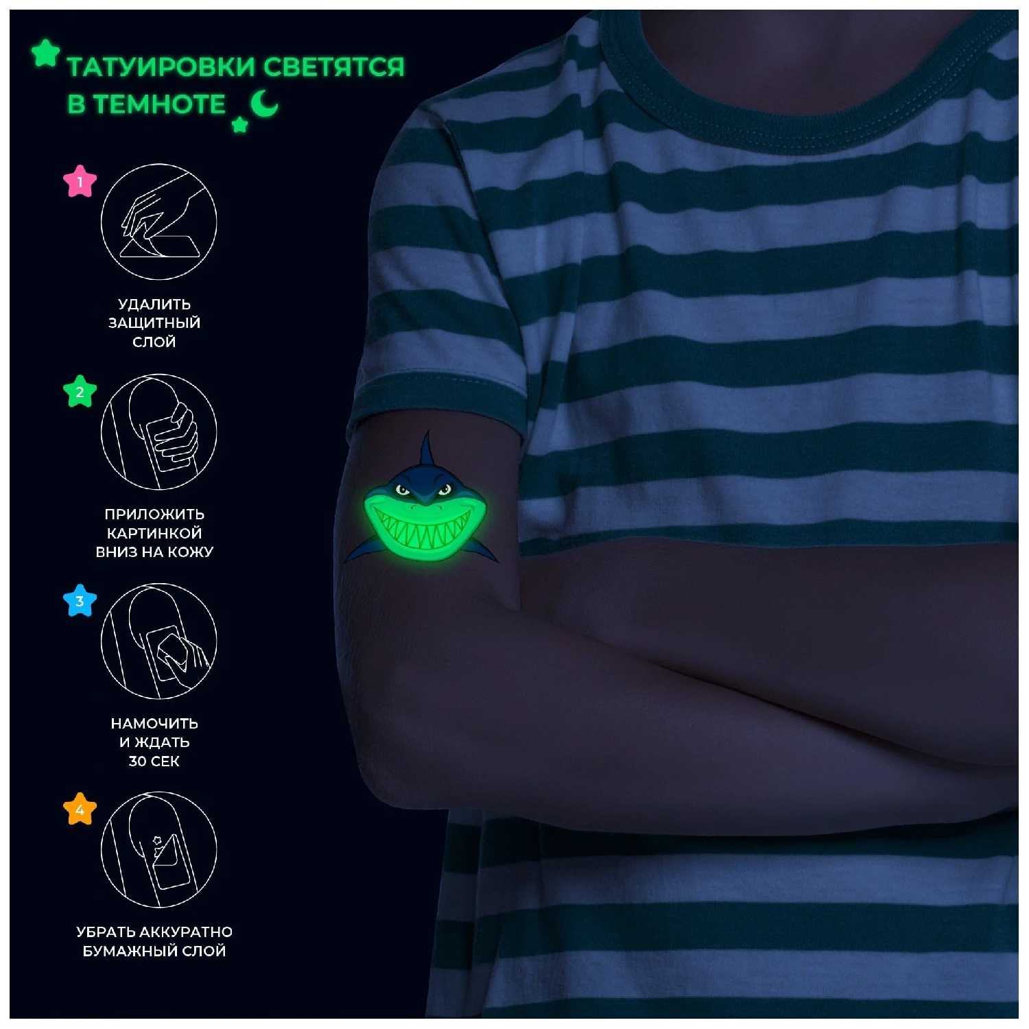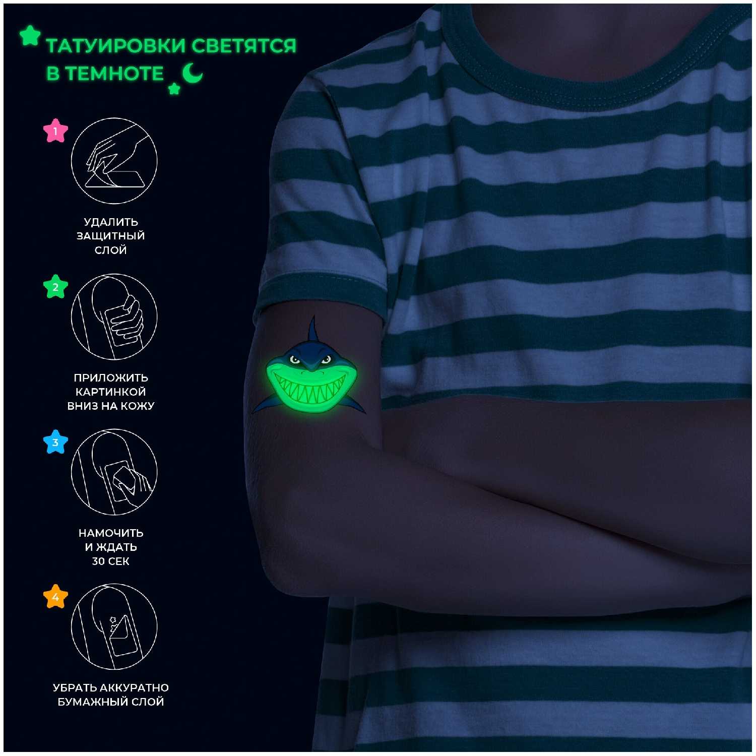 - В набор включены светящиеся переводные татуировки, мотивирующие детей к регулярной гигиене.