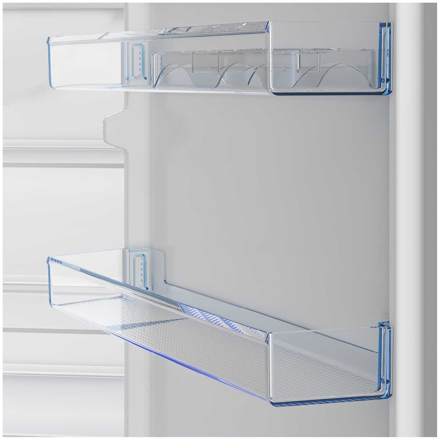 Холодильник оснащён светодиодной подсветкой, которая равномерно освещает камеры при открытии. Дверь поддерживает перевешивание на другую сторону, что удобно для адаптации к планировке кухни. Также предусмотрены регулируемые ножки для точного выравнивания на неровных поверхностях.