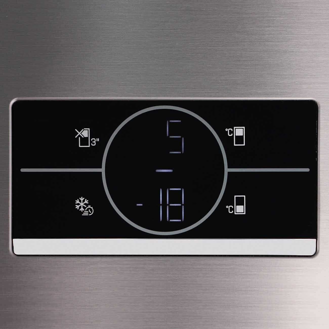 - + Модель довольно высокая, что дает больше места для хранения. Подсветка внутри яркая и с белым светом, без желтизны, все видно четко. Есть удобная полка специально под бутылки, плюс на панели легко регулировать температуру. Если дверь долго открыта, сразу подаст сигнал, чтобы не забыть. Температуру можно ставить отдельно для верхней камеры и для нижней части на дверце холодильника. Дверцы открываются снизу без усилий, хотя для человека ростом 170 см верхние полки стоят высоко, зато детям это как раз по душе. В морозилке две полки идут на полную глубину, а нижняя чуть короче.